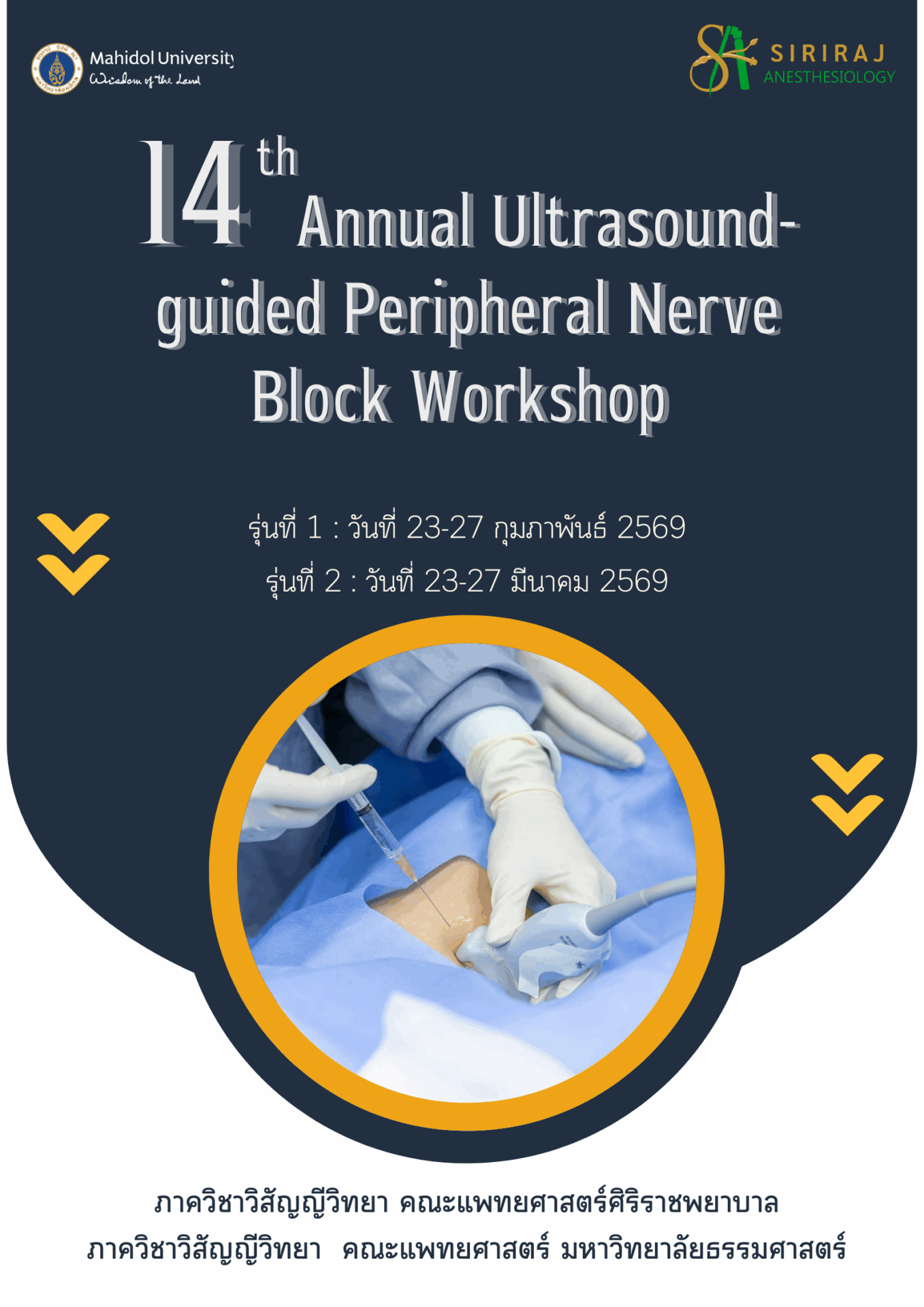 ภาควิชาวิสัญญีวิทยา คณะแพทยศาสตร์ศิริราชพยาบาล ได้กำหนดจัดโครงการอบรมเชิงปฏิบัติการ 14th Annual Ultrasound-guided peripheral nerve block workshop