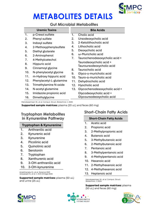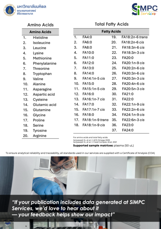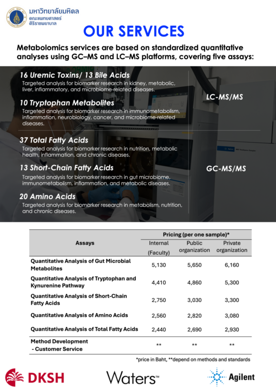 คณะแพทยศาสตร์ศิริราชพยาบาล โดยศูนย์วิจัยเป็นเลิศด้านชีวโมเลกุลและฟีโนมศิริราช (SiMPC) ร่วมกับภาควิชาชีวเคมี เปิดศูนย์ SiMPC Service เพื่อให้บริการวิเคราะห์เมตาโบโลมิกส์และลิพิดส์โดมิกส์ด้วยเทคโนโลยี LC-MS/MS, GC-MS/MS และ Ion Mobility–Mass Spectrometry รองรับงานวิจัยทางคลินิก การวิเคราะห์ตัวอย่างอาหาร และผลิตภัณฑ์ธรรมชาติ เพื่อสนับสนุนการแพทย์แม่นยำและงานวิจัยด้านวิทยาศาสตร์สุขภาพ