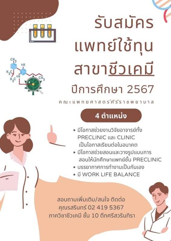 รับสมัครแพทย์ใช้ทุนสาขาชีวเคมี ปีการศึกษา 2567 16 Oct รับสมัครแพทย์ใช้ทุนสาขาชีวเคมี ปีการศึกษา 2567 4 ตำแหน่ง มีโอกาสช่วยงานวิจัยอาจารย์ทั้ง PRECLINIC และ CLINIC เป็นโอกาสเรียนต่อในอนาคต มีโอกาสช่วยสอนและวางรูปแบบการสอนให้นักศึกษาแพทย์ชั้น PRECLINIC บรรยากาศการทำงานเป็นกันเอง มี WORK LIFE BALANCE