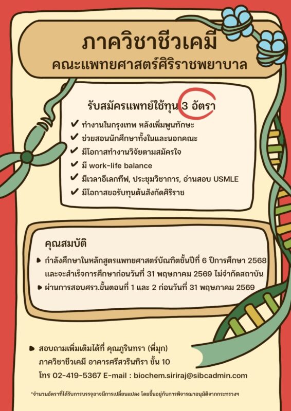 รับสมัครแพทย์ใช้ทุนสาขาชีวเคมี ปีการศึกษา 2568 3 ตำแหน่ง มีโอกาสช่วยงานวิจัยอาจารย์ทั้ง PRECLINIC และ CLINIC เป็นโอกาสเรียนต่อในอนาคต มีโอกาสช่วยสอนและวางรูปแบบการสอนให้นักศึกษาแพทย์ชั้น PRECLINIC บรรยากาศการทำงานเป็นกันเอง มี WORK LIFE BALANCE