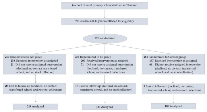 Protein-energy malnutrition still impacts children’s growth and development. We investigated the prolonged effects of egg supplementation on growth and microbiota in primary school children. For this study, 8-14-year-old students (51.5% F) in six rural schools in Thailand were randomly assigned into three groups: (1) whole egg (WE), consuming 10 additional eggs/week (n = 238) (n = 238); (2) protein substitute (PS), consuming yolk-free egg substitutes equivalent to 10 eggs/week (n = 200); and (3) control group (C, (n = 197)). The outcomes were measured at week 0, 14, and 35. At the baseline, 17% of the students were underweight, 18% were stunted, and 13% were wasted. At week 35, compared to the C group the weight and height difference increased significantly in the WE group (3.6 ± 23.5 kg, p < 0.001; 5.1 ± 23.2 cm, p < 0.001). No significant differences in weight or height were observed between the PS and C groups. Significant decreases in atherogenic lipoproteins were observed in the WE, but not in PS group. HDL-cholesterol tended to increase in the WE group (0.02 ± 0.59 mmol/L, ns). The bacterial diversity was similar among the groups. The relative abundance of Bifidobacterium increased by 1.28-fold in the WE group compared to the baseline and differential abundance analysis which indicated that Lachnospira increased and Varibaculum decreased significantly. In conclusion, prolonged whole egg supplementation is an effective intervention to improve growth, nutritional biomarkers, and gut microbiota with unaltered adverse effects on blood lipoproteins.