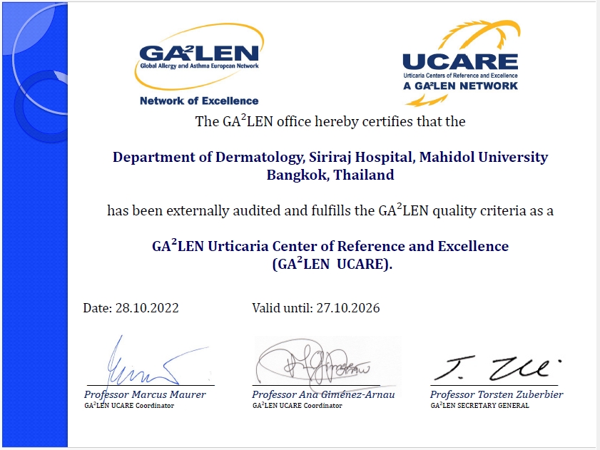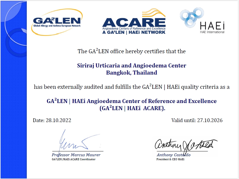 ศูนย์โรคลมพิษและแองจีโออีดีมาศิริราช ได้รับการรับรองมาตรฐานจาก The Global Allergy and Asthma European Network (GA2LEN) เป็น Urticaria Center of Reference and Excellence (UCARE) ในปี 2018 และได้รับการรับรองเพิ่มเติมเป็น Angioedema Center of Reference and Excellence (ACARE) ในปี 2020
