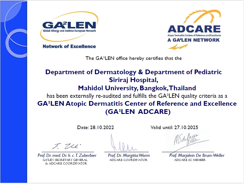 ศูนย์โรคภูมิแพ้ผิวหนัง ภาควิชาตจวิทยา โรงพยาบาลศิริราช ร่วมกับภาควิชากุมารเวชศาสตร์ โรงพยาบาลศิริราช ได้รับการรับรองมาตรฐานจาก The Global Allergy and Asthma European Network (GA2LEN) เป็น Atopic Dermatitis Center of Reference and Excellence (ADCARE) ในปี 2022