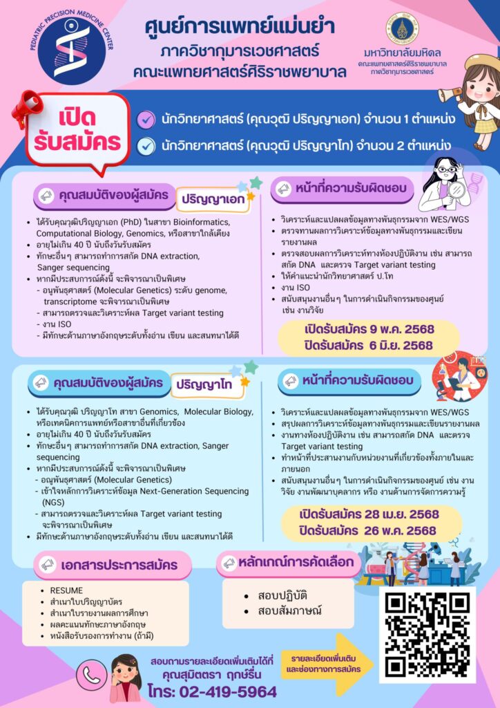 ประกาศรับสมัครคัดเลือกบุคลากร “ศูนย์การแพทย์แม่นยำ”✨ Pediatric Precision Medicine Center