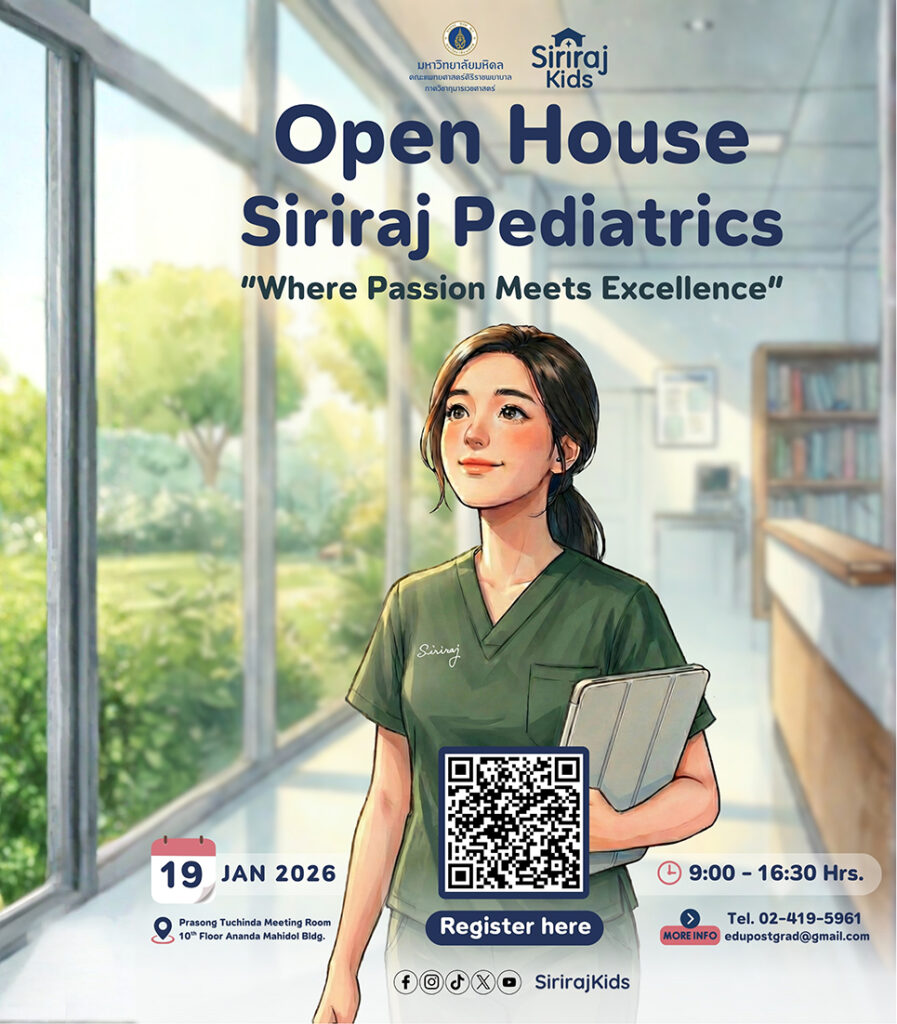 มาร่วมค้นพบความพิเศษของภาควิชากุมารเวชศาสตร์ในวัน Open House โอกาศสำคัญสำหรับแพทย์ที่มีความฝันและความหลงใหลในวิชากุมารเวชศาสตร์ ร่วมค้นพบแรงบันดาลใจใหม่ ๆ และสัมผัสเส้นทางการเรียนต่อเฉพาะทางที่หล่อหลอมแพทย์ผู้เปี่ยมด้วยความมุ่งมั่นและความเป็นเลิศ