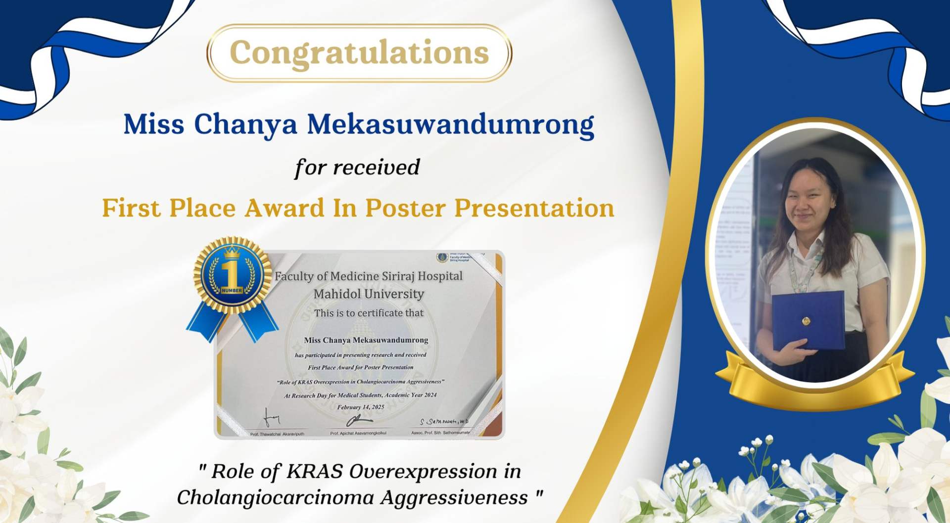 ภาควิชาเภสัชวิทยา ขอแสดงความยินดีกับ “นางสาวจรรยา มาคะสุวรรณดํารงค์” ในโอกาสได้รับรางวัล The First Place Award In Poster Presentation ด้วยผลงานเรื่อง “Role of KRAS Overexpression in Cholangiocarcinoma Aggressiveness “ เมื่อวันที่ 14 กุมภาพันธ์ 2568