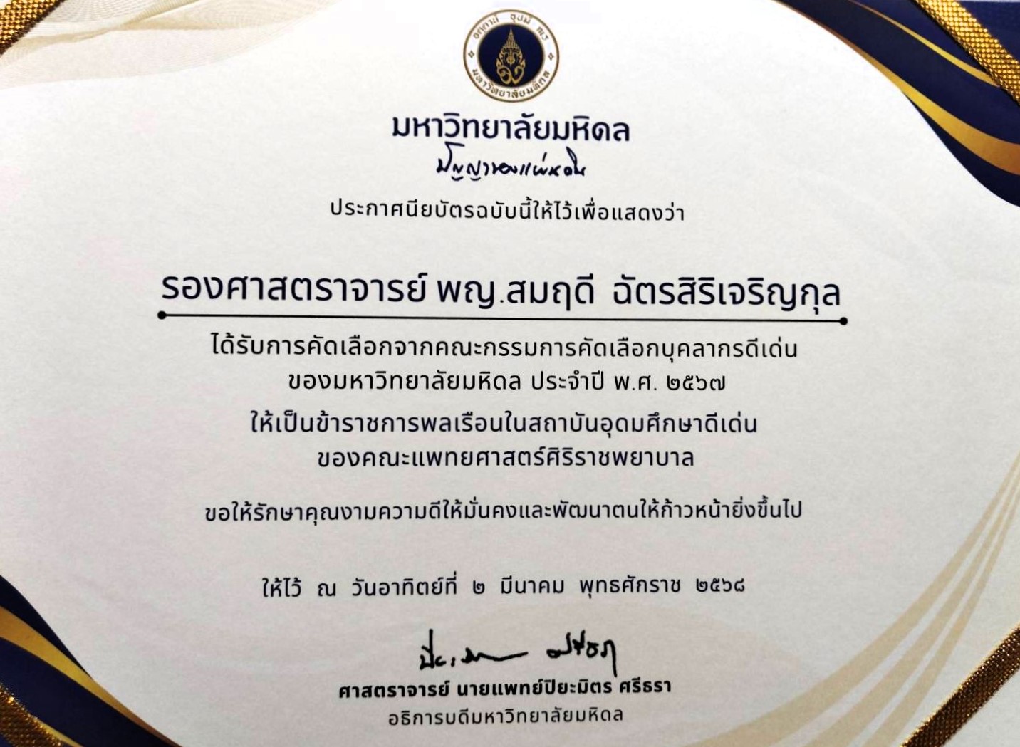 ขอแสดงความยินดีแก่ รศ. พญ.สมฤดี ฉัตรสิริเจริญกุล ในโอกาสได้รับการคัดเลือกให้เป็น “ข้าราชการพลเรือนในสถาบันอุดมศึกษาดีเด่นของคณะแพทยศาสตร์ศิริราชพยาบาล”