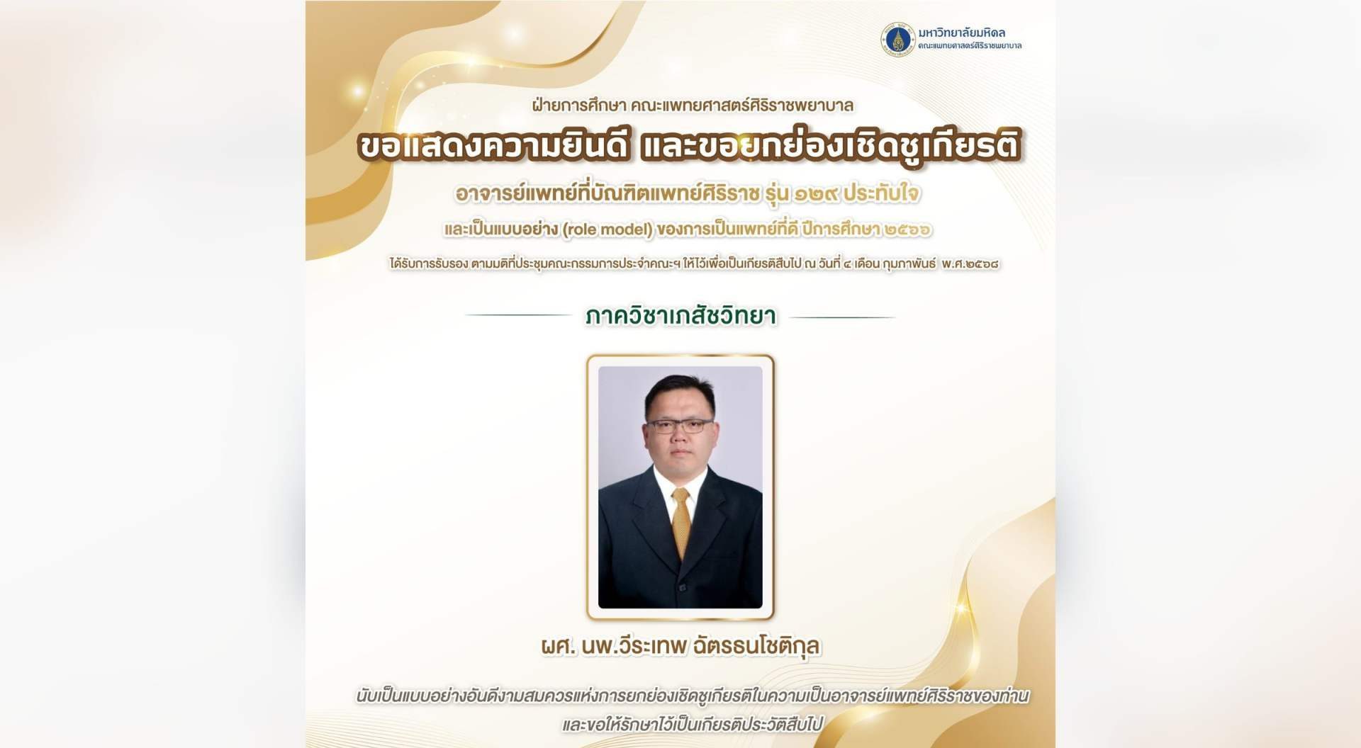 ฝ่ายการศึกษา คณะแพทยศาสตร์ศิริราชพยาบาล ขอแสดงความยินดีและขอยกย่องเชิดชูเกียรติ อาจารย์แพทย์ ผศ. นพ.วีระเทพ ฉัตรธนโชติกุล ภาควิชาเภสัชวิทยา ที่ได้รับการยกย่องชื่นชมจากบัณฑิตแพทย์ศิริราช รุ่น 129 ว่า “เป็นอาจารย์แพทย์ที่บัณฑิตแพทย์ประทับใจ และเป็นแบบอย่าง (role model) ของการเป็นแพทย์ที่ดี”