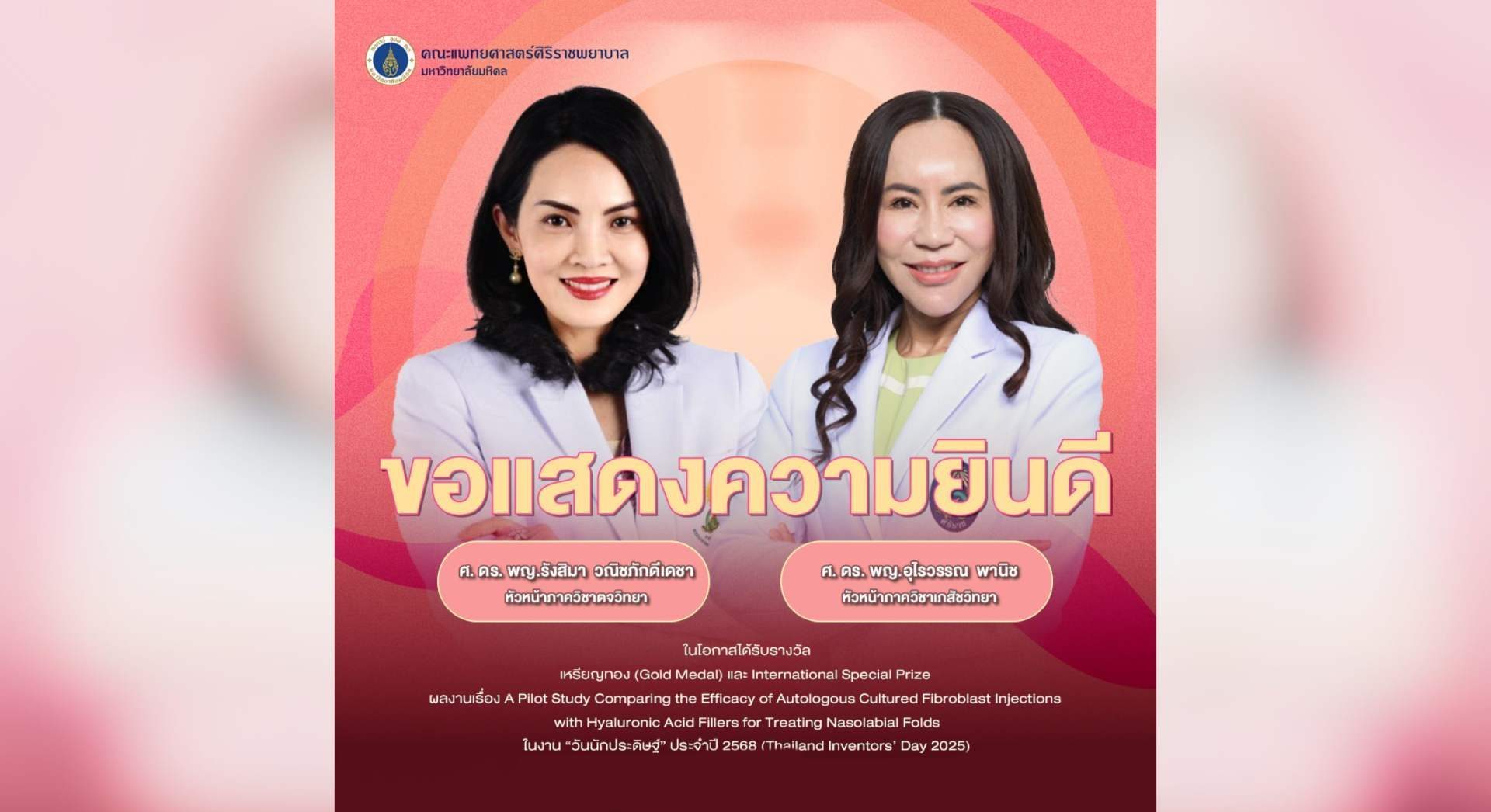 คณะแพทยศาสตร์ศิริราชพยาบาล มหาวิทยาลัยมหิดล ขอแสดงความยินดีแก่ ศ. ดร. พญ.รังสิมา วณิชภักดีเดชา หัวหน้าภาควิชาตจวิทยา เเละ ศ. ดร. พญ.อุไรวรรณ พานิช หัวหน้าภาควิชาเภสัชวิทยา ในโอกาสได้รับรางวัลเหรียญทอง (Gold Medal) และ International Special Prize จากผลงานเรื่อง A Pilot Study Comparing the Efficacy of Autologous Cultured Fibroblast Injections with Hyaluronic Acid Fillers for Treating Nasolabial Folds จาก