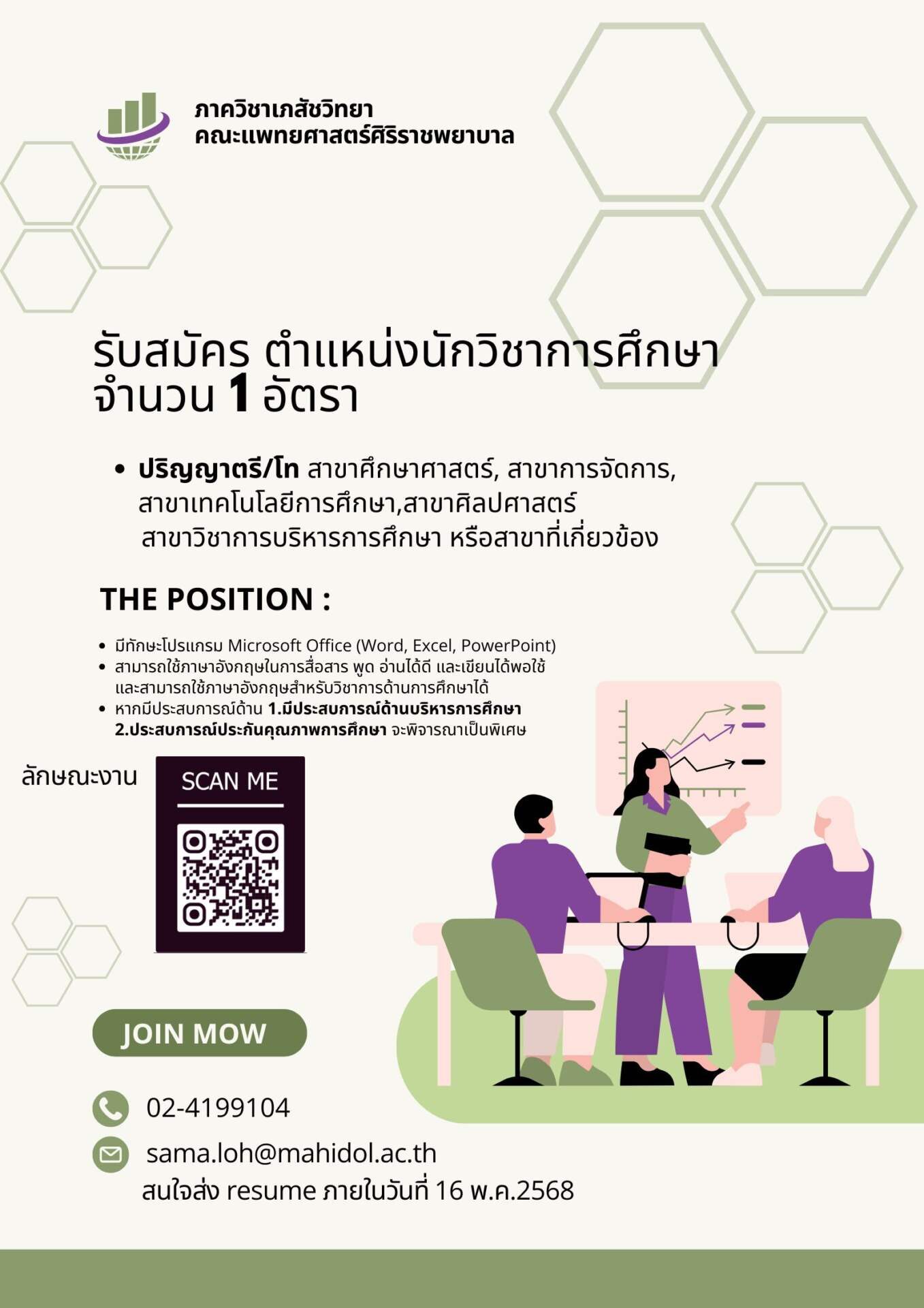 Send your cover letter explaining your interests and fit for the role, CV, transcript, and English proficiency score (TOEIC/ MU-GRAD/ IELTS/ or TOEFL IBT/ITP/CBT) to: sama.loh@mahidol.ac.th