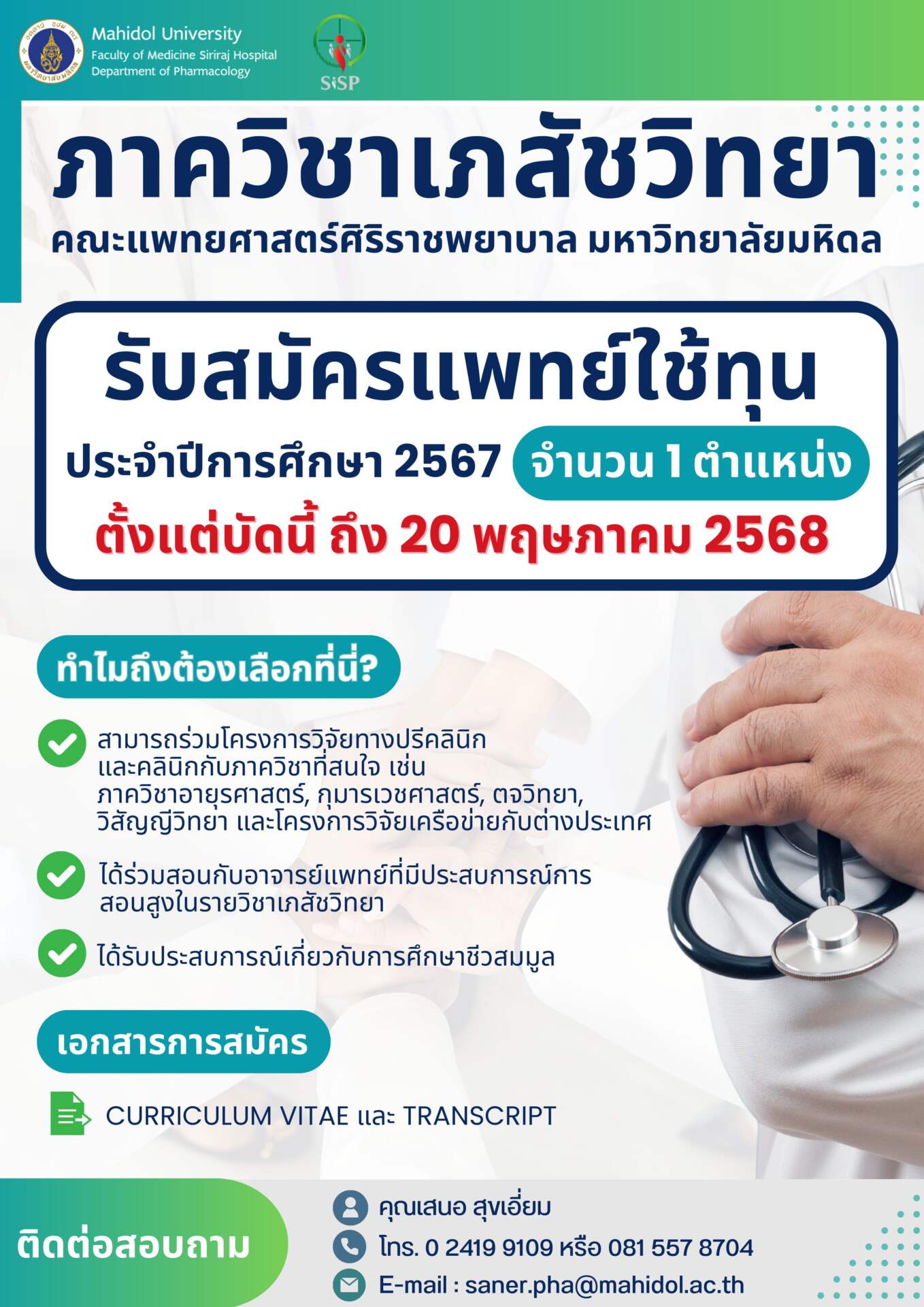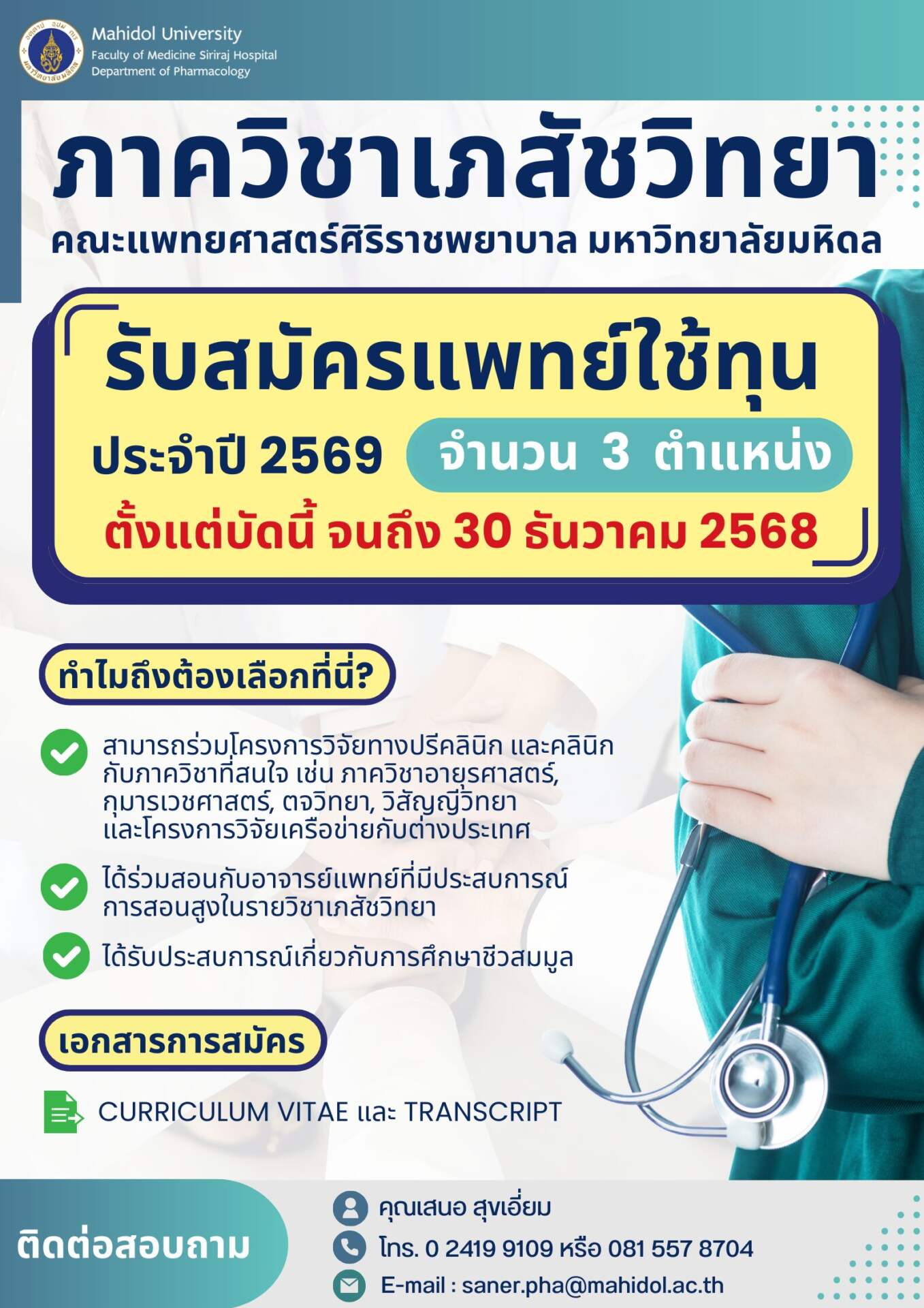 ภาควิชาเภสัชวิทยา รับสมัครแพทย์ใช้ทุน ประจำปีการศึกษา 2569 จำนวน 3 อัตรา ตั้งแต่วันนี้ จนถึง 30 ธันวาคม 2568
