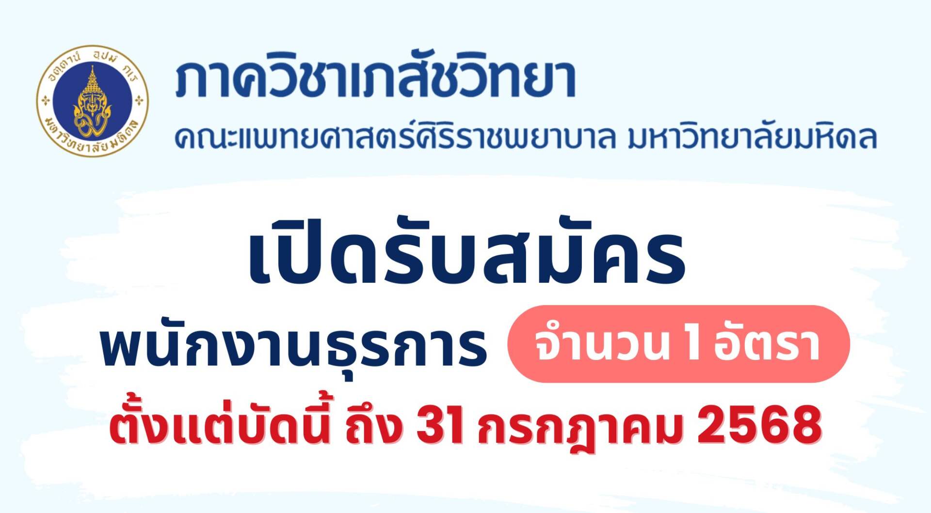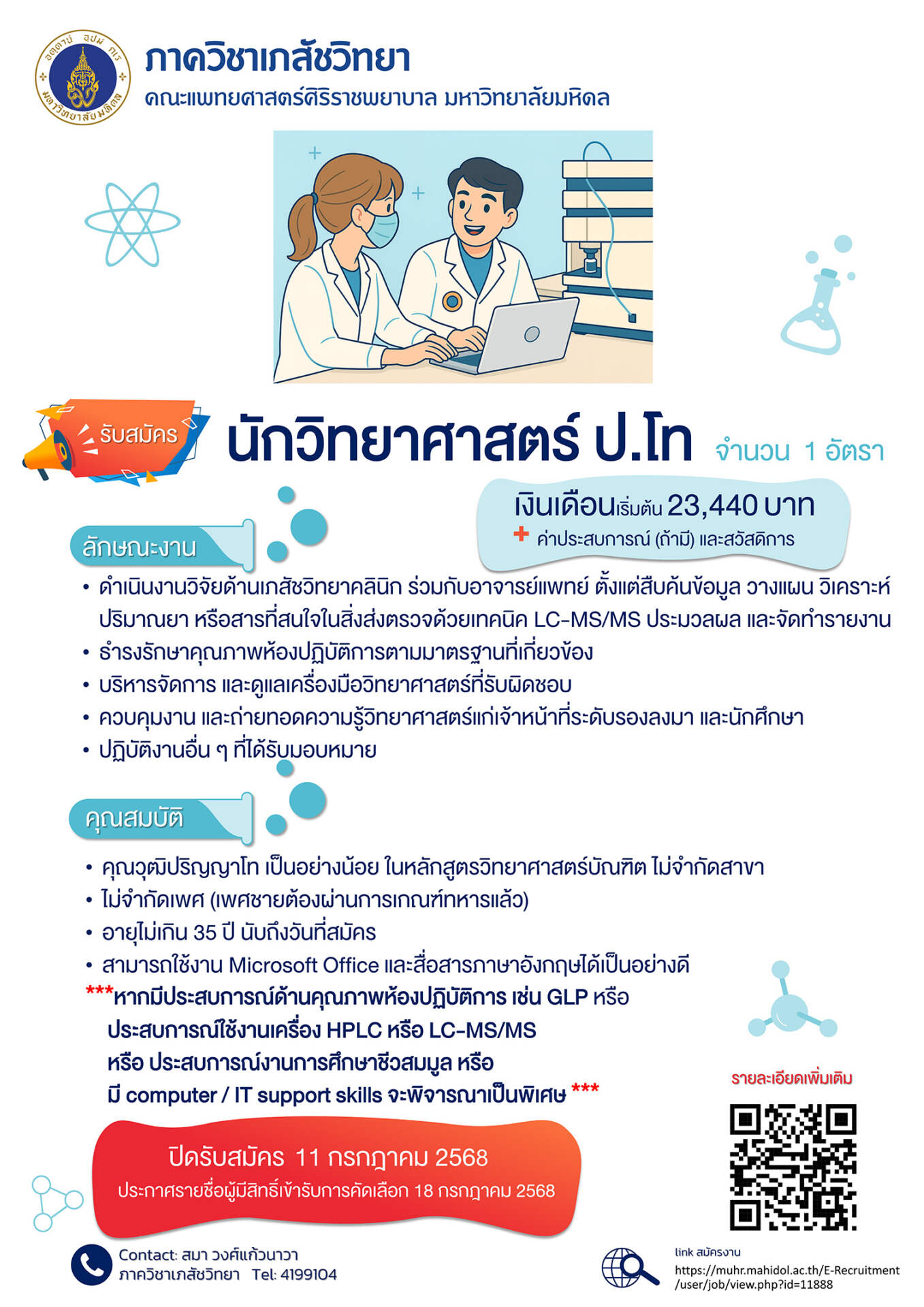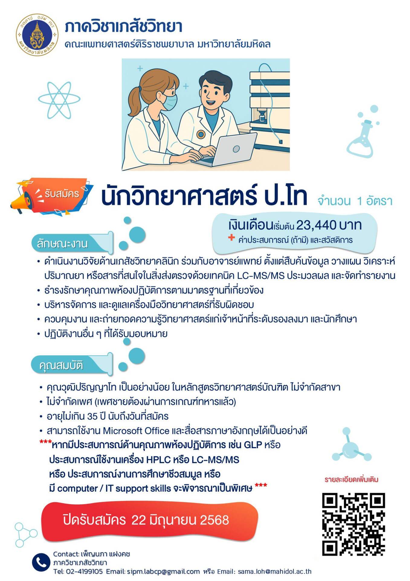 ภาควิชาเภสัชวิทยา เปิดรับสมัคร นักวิทยาศาสตร์ ป.โท จำนวน 1 อัตรา ตั้งแต่วันนี้ จนถึง 22 มิถุนายน 2568