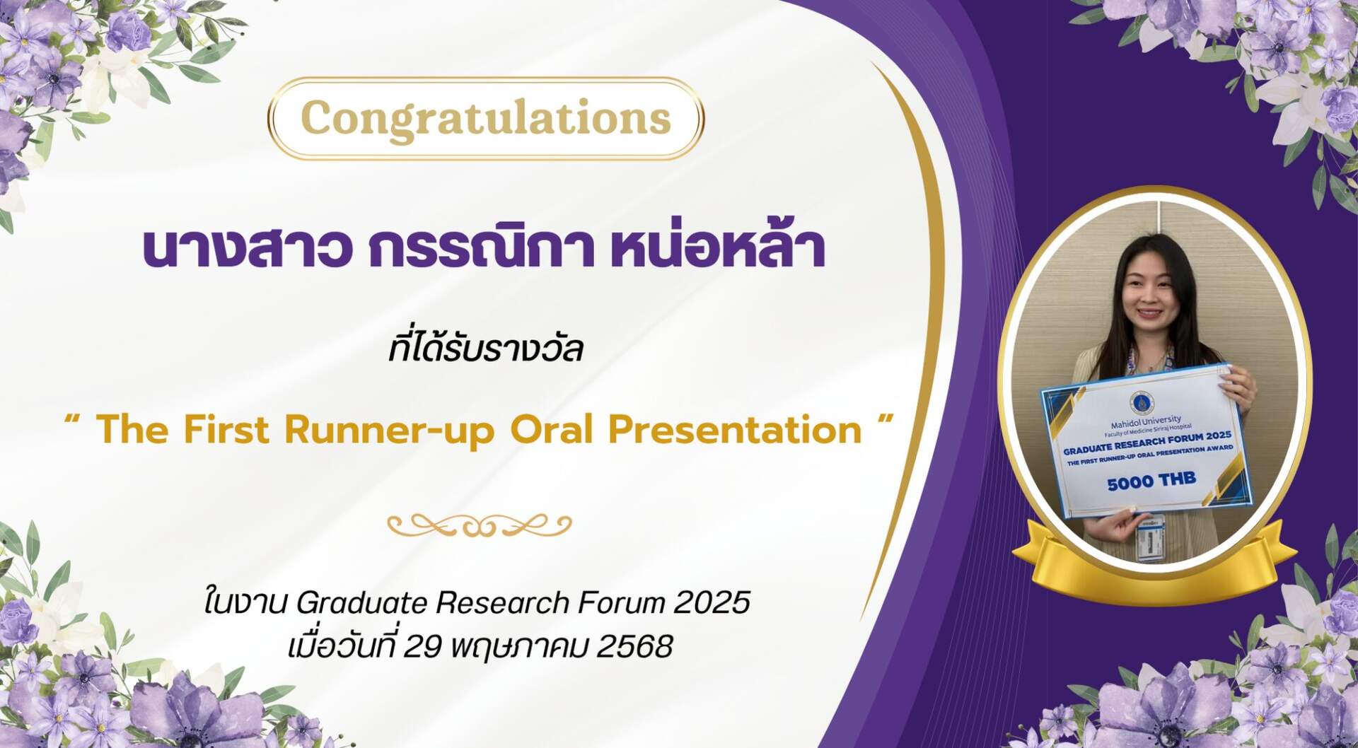ขอแสดงความยินดีกับ นางสาวกรรณิกา หน่อหล้า ในโอกาสได้รับรางวัล The First Runner-up Oral Presentation ณ งาน Graduate Research Forum 2025