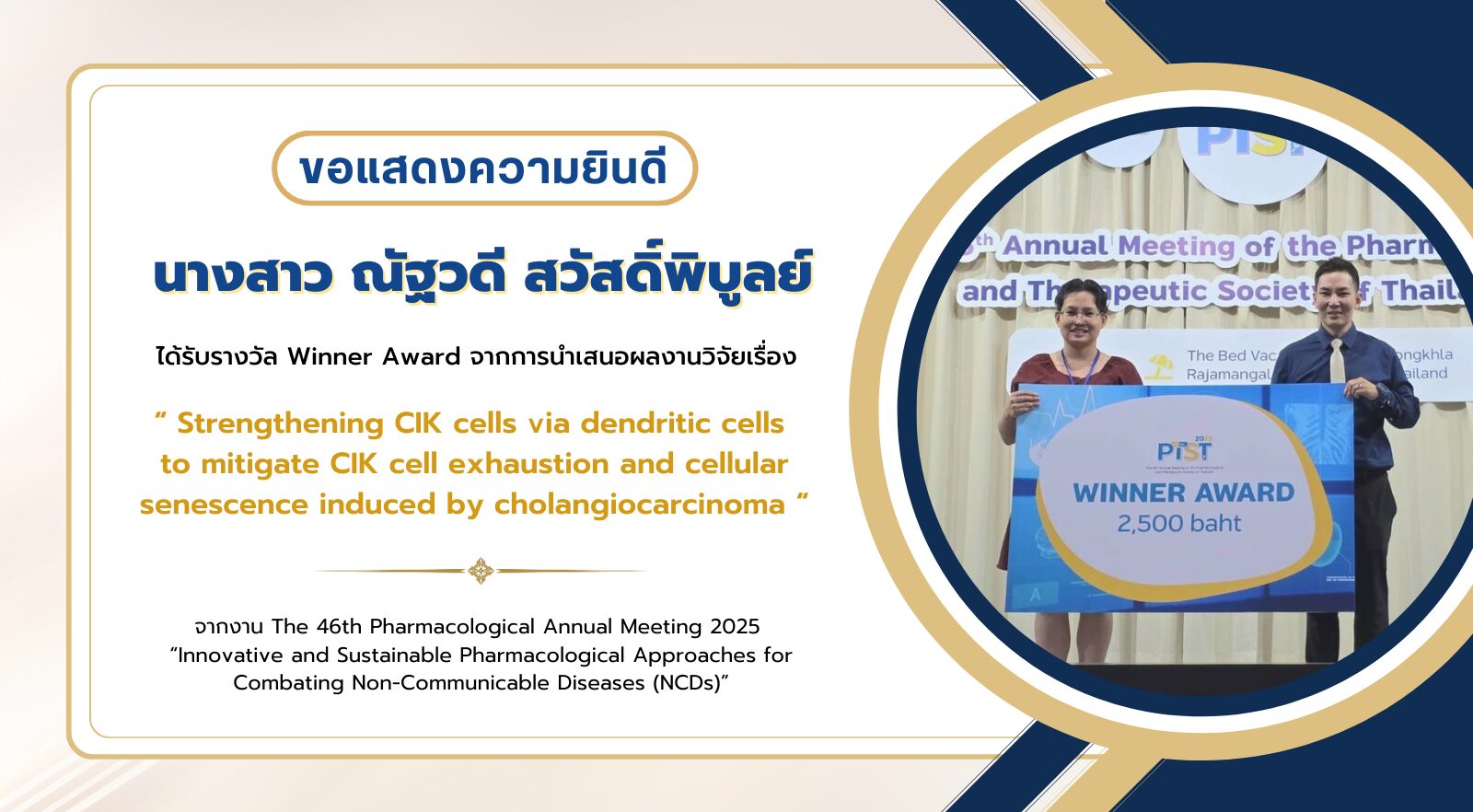 ขอแสดงความยินดีกับ น.ส.ณัฐวดี สวัสดิ์พิบูลย์ ในโอกาสได้รับรางวัล Winner Award จากงาน The 46th Pharmacological Annual Meeting 2025