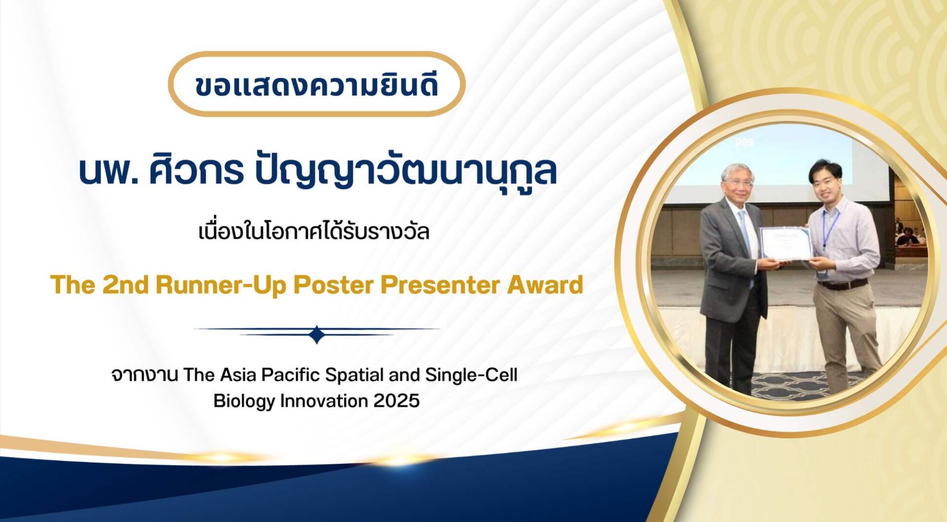 ขอแสดงความยินดีกับ นพ. ศิวกร ปัญญาวัฒนานุกูล เนื่องในโอกาสได้รับรางวัล the 2nd Runner-up Award จากงาน the Asia Pacific Spatial and Single-Cell Biology Innovation 2025