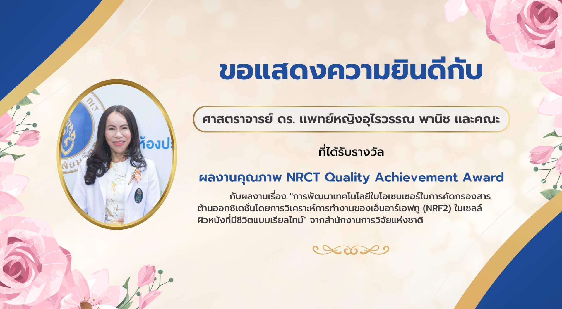 ขอแสดงความยินดีกับ ศาสตราจารย์ ดร.อุไรวรรณ พานิช ภาควิชาเภสัชวิทยา คณะแพทยศาสตร์ศิริราชพยาบาลมหาวิทยาลัยมหิดล ได้รับรางวัลผลงานคุณภาพ NRCT Quality Achievement Award ผลงาน “การพัฒนาเทคโนโลยีไบโอเซนเซอร์ในการคัดกรองสารต้านออกซิเดชั่น โดยการวิเคราะห์การทำงานของ Nrf2 ในเซลล์ผิวหนังที่มีชีวิตแบบเรียลไทม์”