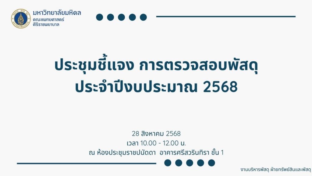 ประชุมการตรวจพัสดุประจำปีงบประมาณ 2568 วันที่ 28 สิงหาคม 2568 ฝ่ายทรัพย์สินและพัสดุได้ทำการจัดประชุมการตรวจพัสดุประจำปีงบ 2568 โดยมีวัตถุประสงค์เพื่อให้เข้าใจเกี่ยวกับการตรวจพัสดุประจำปี 2568 โดยสามารถดาวน์โหลดเอกสารประกอบการประชุม ได้ที่ “เอกสารประกอบ” ดาวน์โหลดเอกสารประกอบ
