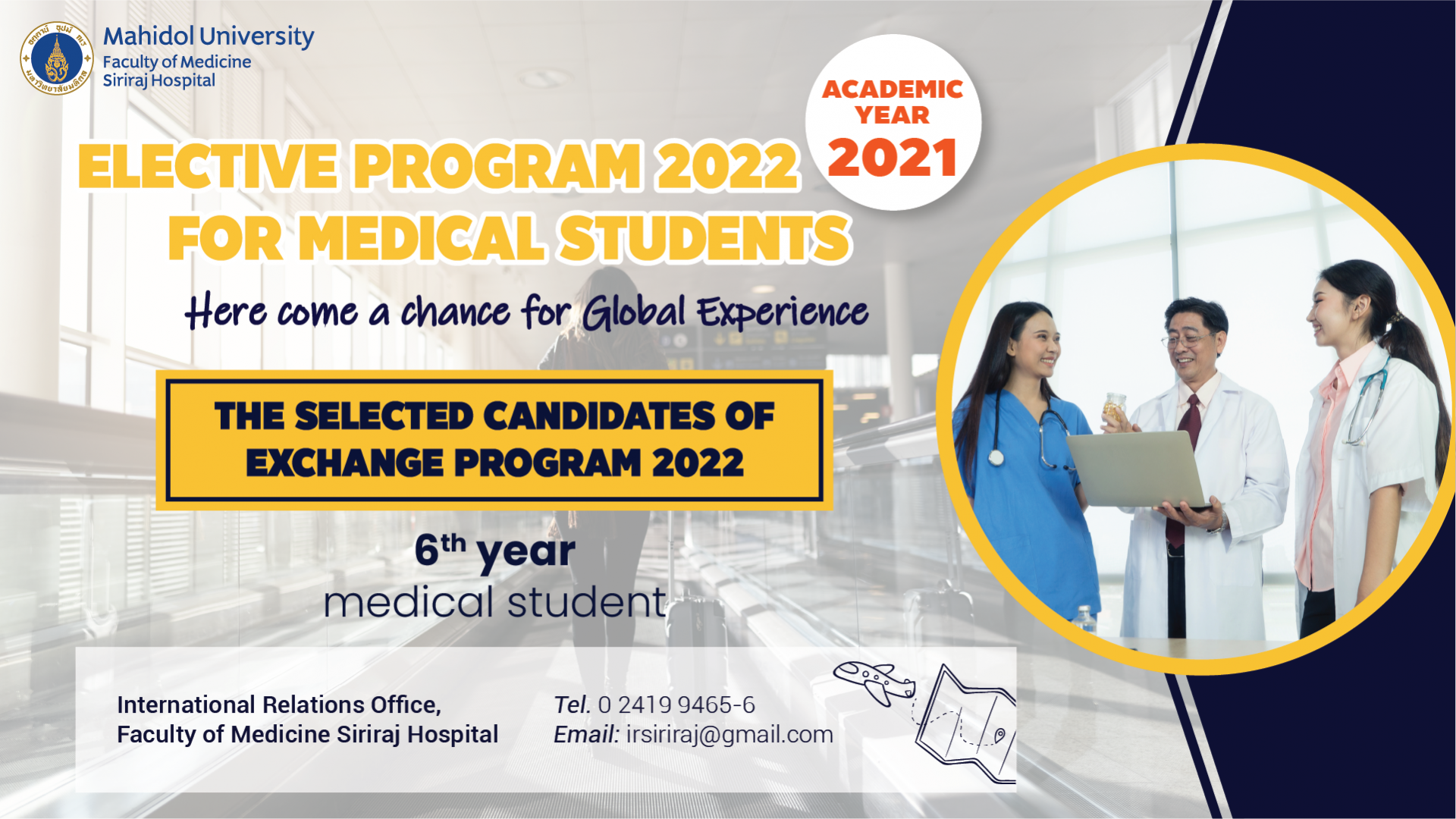 We are pleased to announce the selected candidates (6th-year medical students) of the Elective Program 2022 (Academic Year 2021). The selected candidates can check the funding budget at Internation Relations Office.