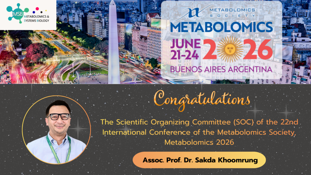 We extend our congratulations to Assoc. Prof. Dr. Sakda Khoomrung of the Siriraj Center of Research Excellence in Metabolomic and Systems Biology (SiCORE-MSB), Faculty of Medicine, Siriraj Hospital, Mahidol University, on his appointment as The Scientific Organizing Committee (SOC) of the 22nd International Conference of the Metabolomics Society, Metabolomics 2026at Argentina, 2026. You can be access via this link: https://www.metabolomics2026.org/index.cfm?pgid=590