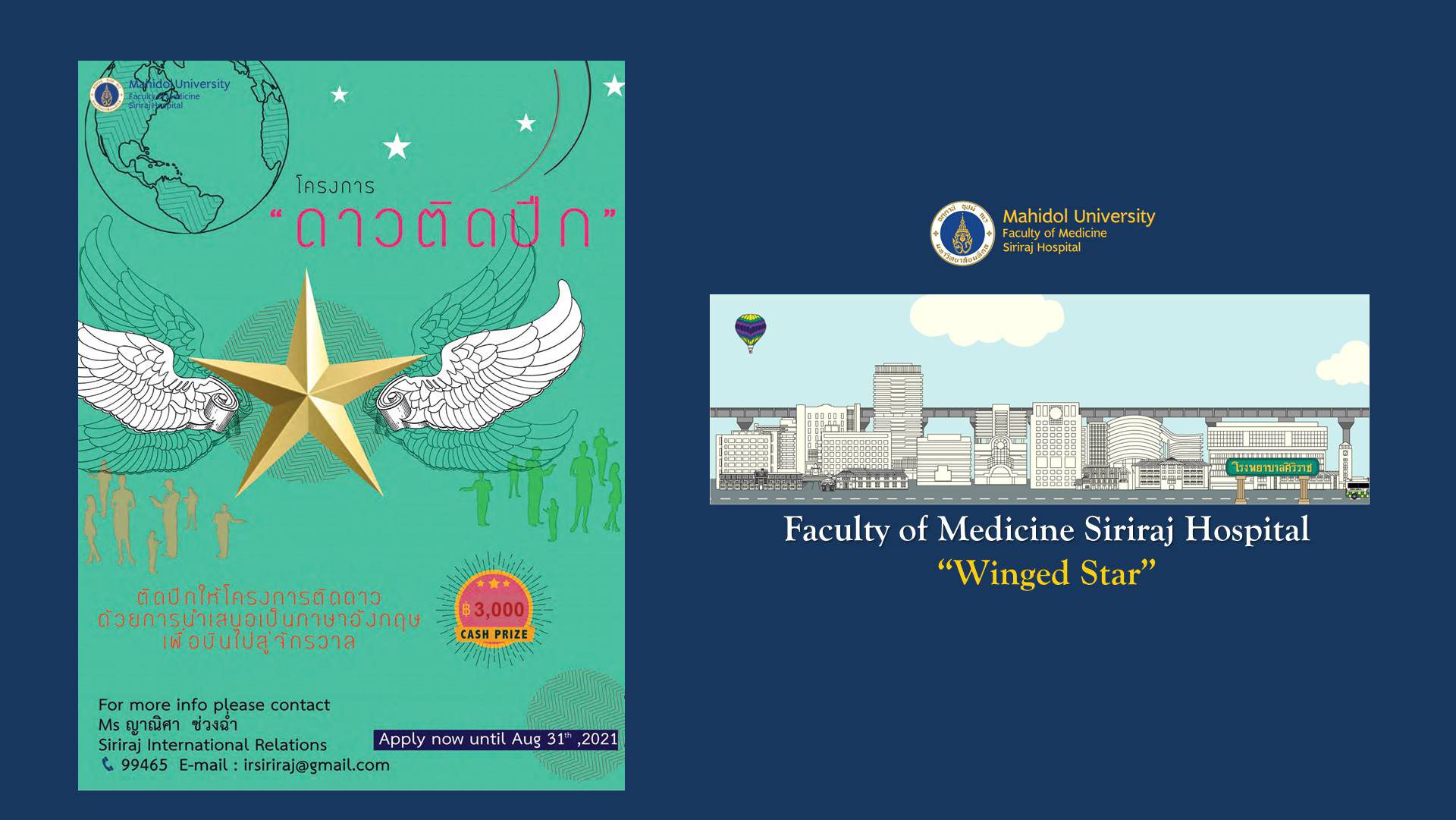 Siriraj International Relations Division is pleased to present “Winged Star Project (โครงการดาวติดปีก)”, the first time for Siriraj staff to share your success stories from Star Project Award in English! Each qualified project will get the 3,000 THB cash, certificate, and English skills development activities.