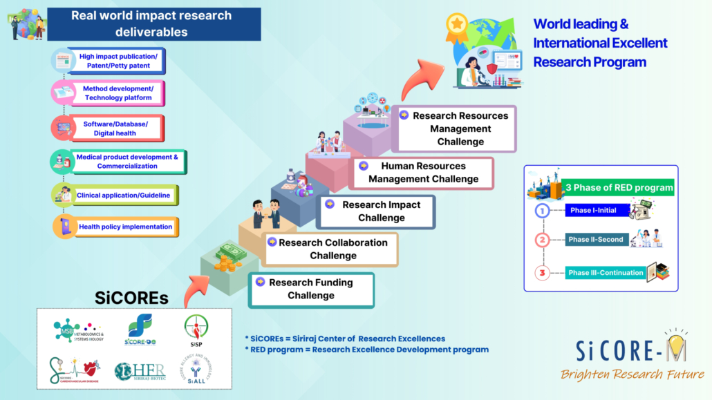 Our team drives the Research Excellence Development (RED) Program, providing end-to-end support to every signature SiCORE (Center of Research Excellence). We oversee recruitment, strategic planning, funding management, and collaborative development while facilitating access to essential research resources and human capital. Through close coordination with investigators and partner units, we identify challenges, streamline operations, and accelerate scientific progress. Our structured support model empowers each SiCORE to achieve its research milestones, enhance productivity, and deliver impactful outcomes that strengthen the research and innovation ecosystem of the Faculty of Medicine Siriraj Hospital.