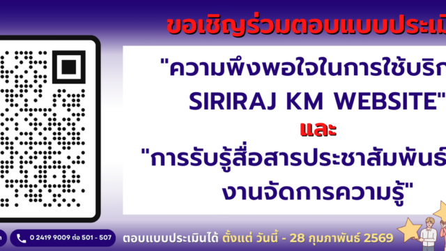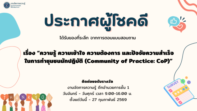 ประกาศผู้โชคดีจากกิจกรรม ตอบแบบสอบถาม “ความรู้ ความเข้าใจ ความต้องการ และปัจจัยความสำเร็จ ในการทำชุมชนนักปฏิบัติ (Community of Practice: CoP)” Posted on 28/01/202628/01/2026 by Siriraj_KM Views : 47 **ขอแสดงความยินดีกับผู้โชคดี และขอขอบคุณสำหรับทุกท่านที่เข้าร่วมกิจกรรมในครั้งนี้ค่ะ/ครับ** ผู้โชคดีได้รับของที่ระลึกจากการร่วมกิจกรรม 081-9XXXX88 092-2XXXX81 085-1XXXX28 081-8XXXX43 083-9XXXX19 กรุณาติดต่อรับของที่ระลึกภายใน 27 กุมภาพันธ์ 2569 […]