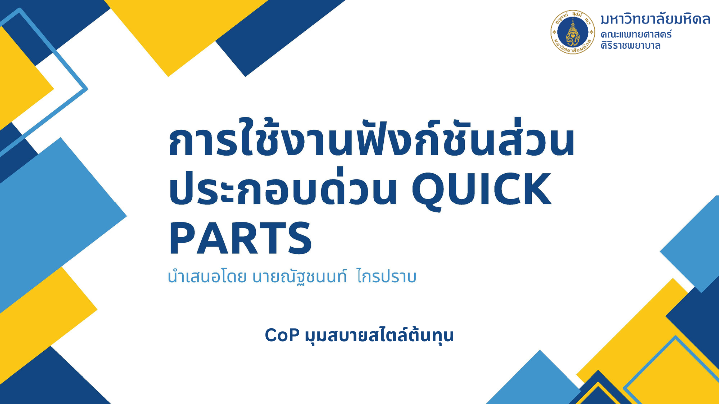 Click Download เพื่อศึกษาตัวอย่าง >> การใช้งานฟังก์ชันส่วนประกอบด่วน Quick Parts