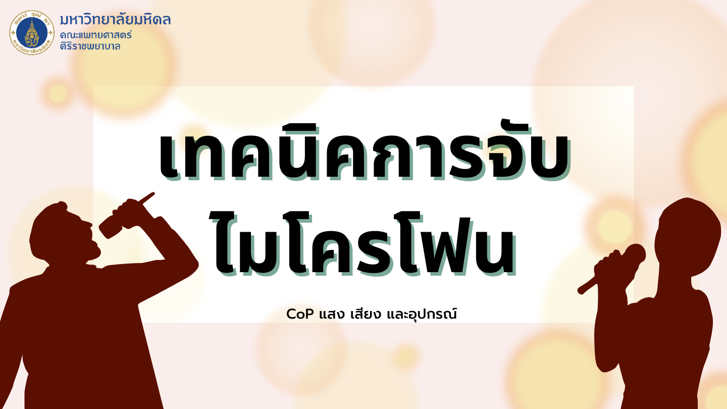 กลุ่ม CoP สาขาแสง เสียง และอุปกรณ์ สถานเทคโนโลยีแพทยศาสตร์ศิริราชพยาบาล จึงได้รวบรวมและแบ่งปันเทคนิคการจับไมโครโฟน เพื่อให้บุคลากรสามารถใช้งานไมโครโฟนได้อย่างมีประสิทธิภาพและเสริมสร้างภาพลักษณ์ความเป็นมืออาชีพในการพูดได้อย่างยอดเยี่ยม