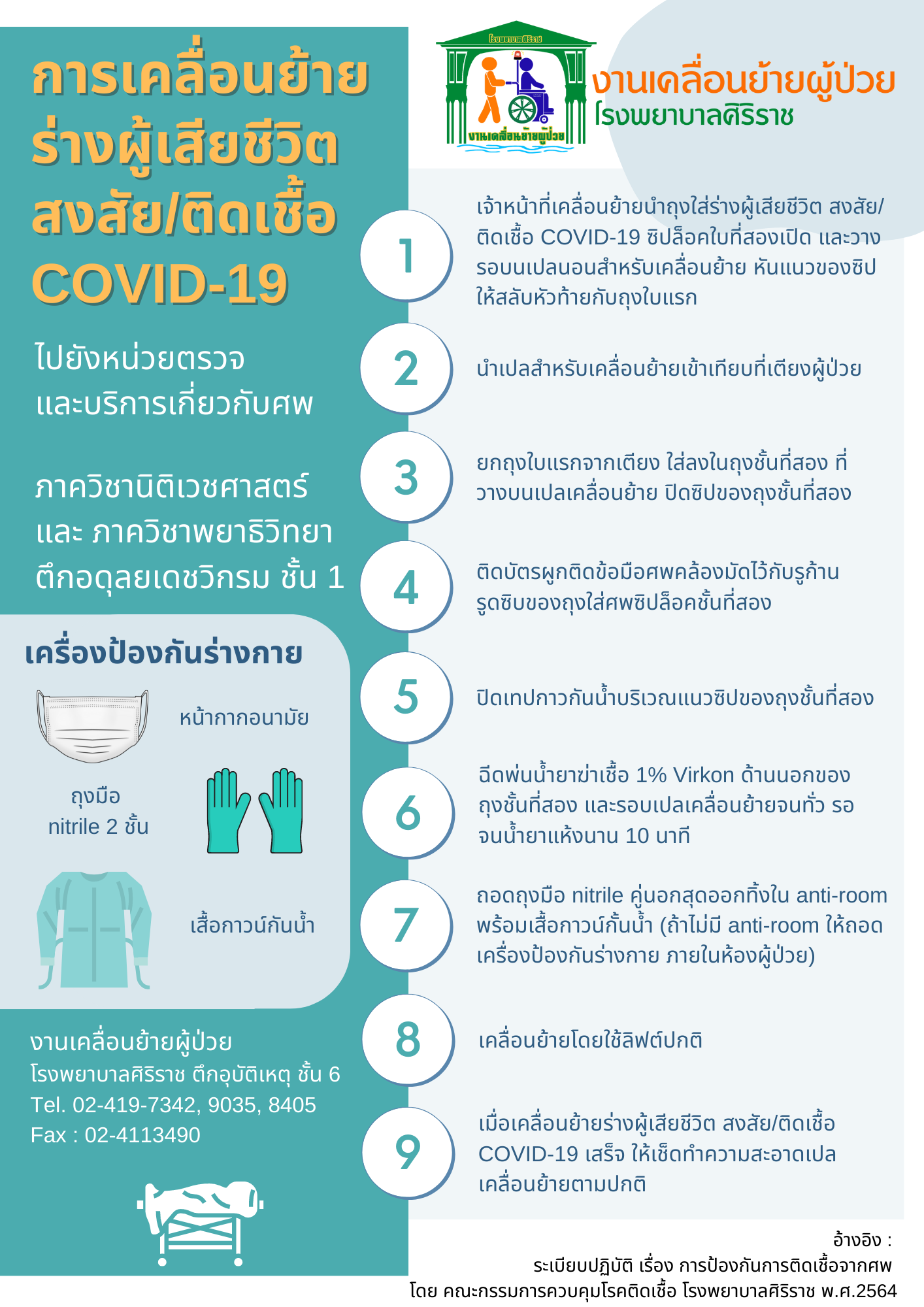 การเคลื่อนย้ายร่างผู้เสียชีวิต สงสัย/ติดเชื้อ COVID-19 ไปยังหน่วยตรวจ และบริการเกี่ยวกับศพ ณ ภาควิชานิติเวชศาสตร์ และ ภาควิชาพยาธิวิทยา ตึกอดุลยเดชวิกรม ชั้น 1