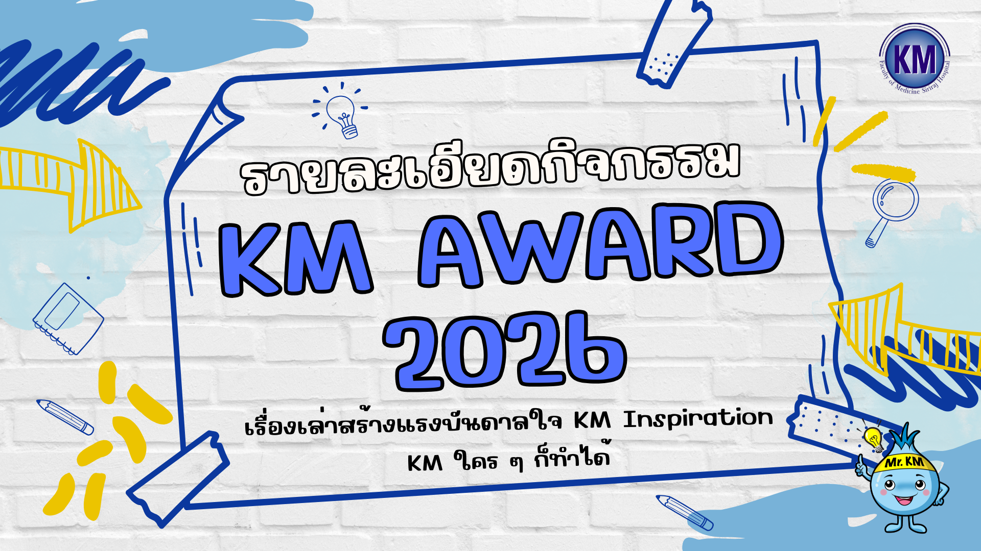 งานจัดการความรู้ คณะแพทยศาสตร์ศิริราชพยาบาล จัดกิจกรรมแลกเปลี่ยนเรียนรู้ โดยการส่งผลงานเข้าประกวดเพื่อถ่ายทอดประสบการณ์การทำงานผ่านเรื่องเล่าสร้างแรงบันดาลใจ : KM Inspiration ภายใต้หัวข้อเรื่อง “KM ใคร ๆ ก็ทำได้” โดยกิจกรรมนี้มีวัตถุประสงค์เพื่อส่งเสริมให้ผู้ปฏิบัติงานเห็นคุณค่าและสร้างแรงบันดาลใจในการปฏิบัติงานผ่าน Siriraj KM Strategy : Link – Share – Learn โดยมุ่งเน้นการพัฒนาคน พัฒนางาน ให้เกิดการสร้างนวัตกรรมใหม่ ๆ ให้เกิดความปลอดภัยและคุณภาพที่ดีต่อผู้รับบริการ หน่วยงาน และองค์กร โดยใช้เรื่องเล่า (Storytelling) ซึ่งเป็นเครื่องมือหนึ่งในการสื่อสาร และส่งเสริมให้บุคลากรของคณะฯ มีพฤติกรรมในการถ่ายทอดประสบการณ์และแลกเปลี่ยนเรียนรู้ซึ่งกันและกัน