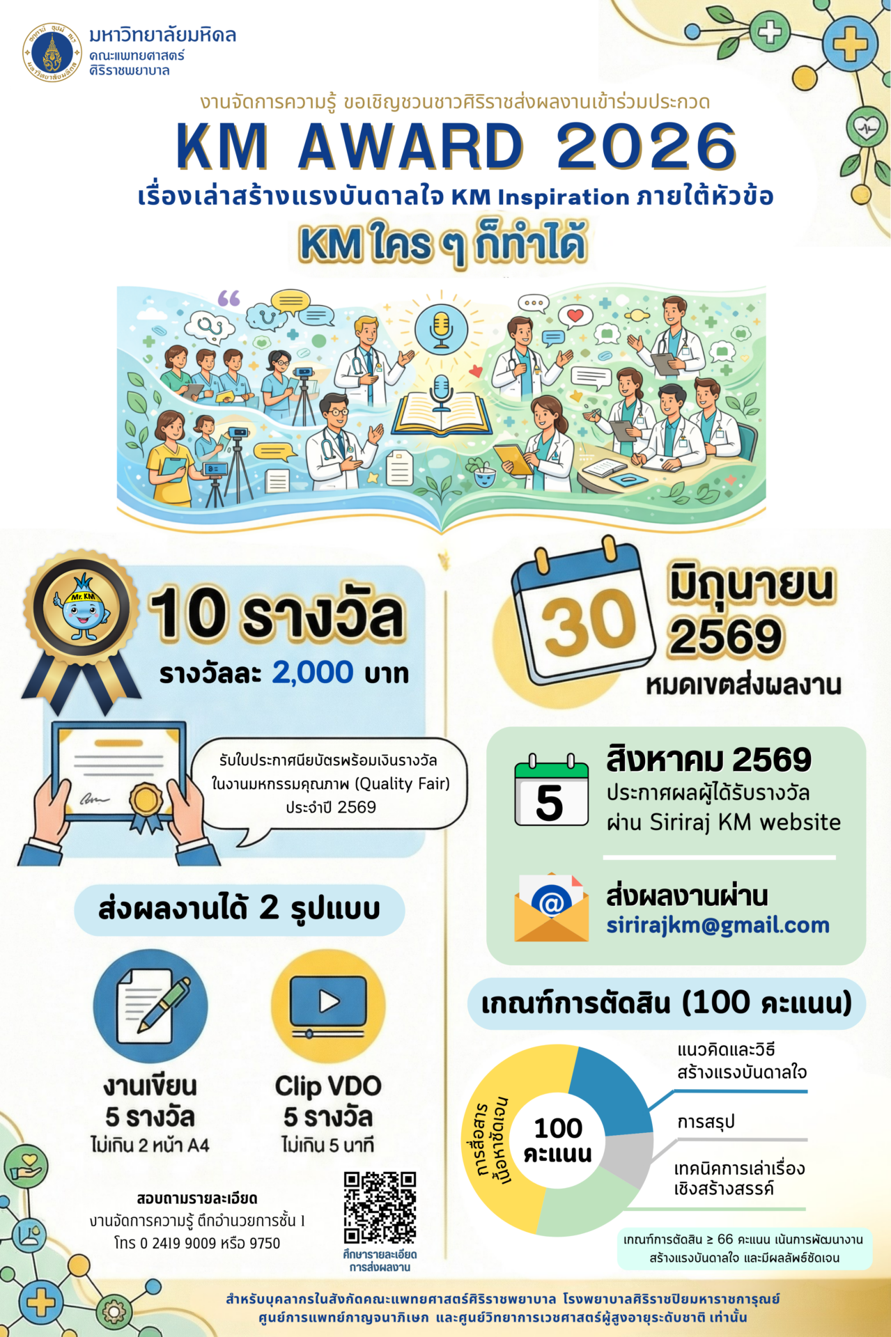 - ประกาศผลวันที่ 5 สิงหาคม 2569 ผ่านทาง Siriraj KM website (www2.si.mahidol.ac.th/km)