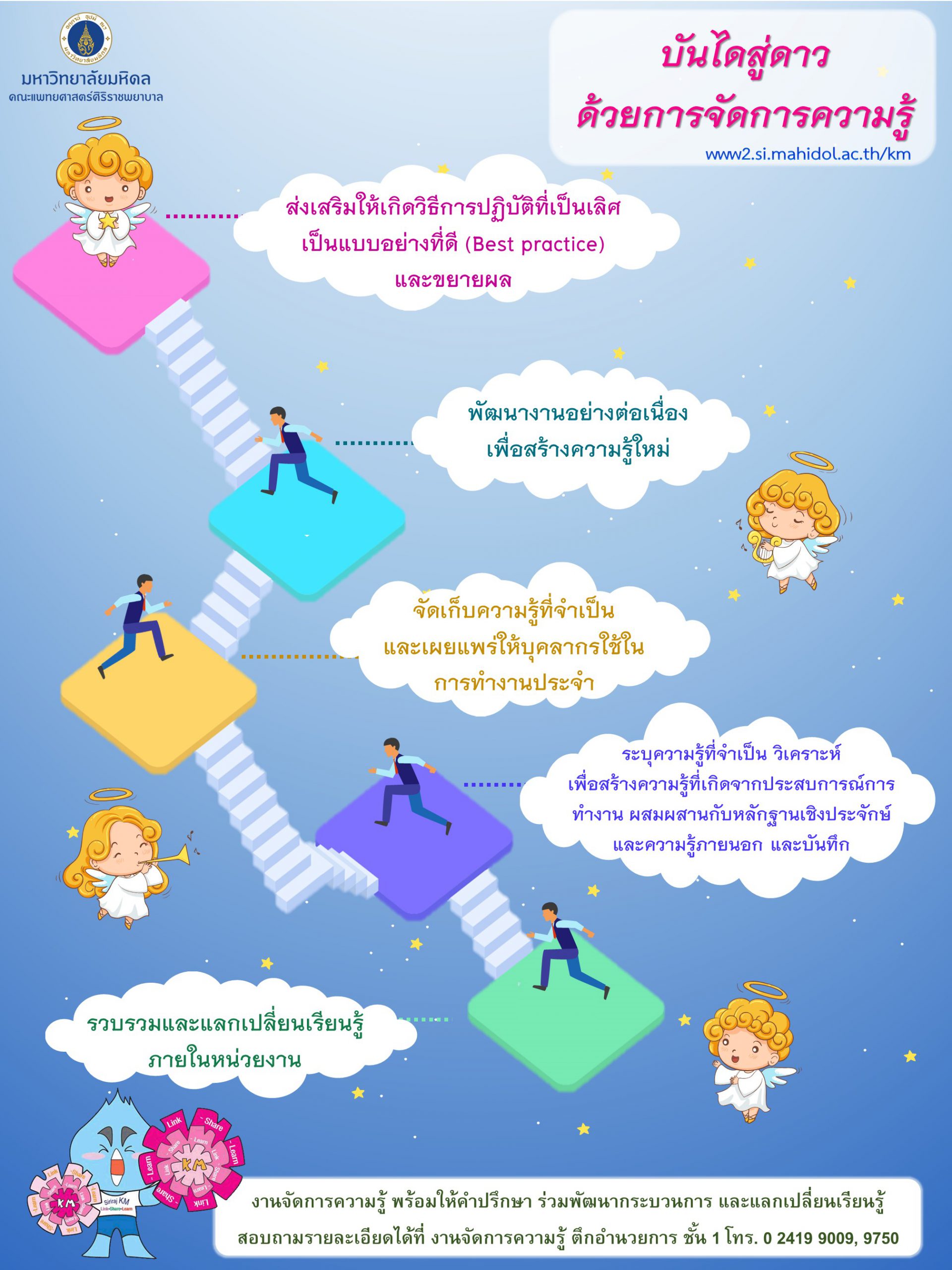 การจัดการความรู้ (Knowledge management หรือ KM) เป็นเครื่องมือหนึ่งที่ช่วยให้การดำเนินงานประสบความสำเร็จ ภาควิชา/หน่วยงานสามารถนำ KM ไปใช้เพื่อต่อยอดผลลัพธ์สู่โครงการติดดาวได้โดยการใช้กระบวนการรวบรวม แลกเปลี่ยนเรียนรู้ภายในหน่วยงาน ระบุความรู้ที่จำเป็น วิเคราะห์ เพื่อสร้างความรู้ที่เกิดจากประสบการณ์การทำงาน ผสมผสานกับหลักฐานเชิงประจักษ์และความรู้ภายนอก รวมทั้งมีการบันทึกจัดเก็บความรู้ และเผยแพร่ให้บุคลากรใช้ใน การทำงานประจำพัฒนางานอย่างต่อเนื่อง ก่อให้เกิดการสร้างความรู้ใหม่ ส่งเสริมให้เกิดวิธีการปฏิบัติที่เป็นเลิศเป็นแบบอย่างที่ดี (Best practice) และสามารถขยายผลต่อไปได้