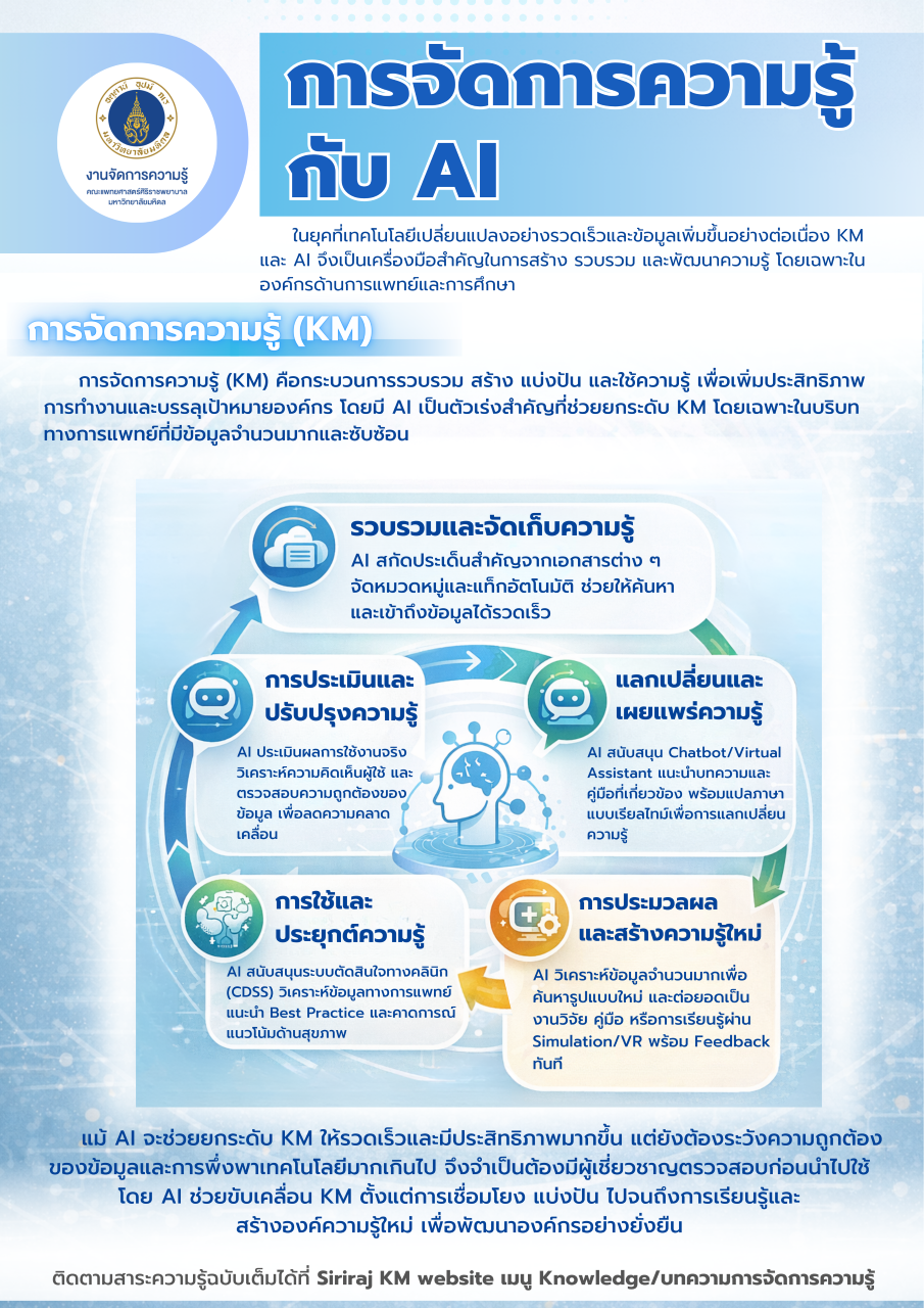 การจัดการความรู้ (KM) เป็นกระบวนการรวบรวม การสร้าง การถ่ายทอดแบ่งปัน และการจัดเก็บความรู้ เผยแพร่ ขยายผล เพื่อให้บุคลากรมีการใช้ความรู้และต่อยอดความรู้ในการทำงานประจำให้เกิดประสิทธิภาพ ประสิทธิผล บรรลุเป้าหมายของคณะฯ ในปัจจุบันที่ AI เข้ามามีบทบาทมากขึ้น เป็นตัวเร่งสำคัญ ที่ช่วยยกระดับการจัดการความรู้ ในองค์กร โดยเฉพาะในบริบททางการแพทย์ที่มีข้อมูลจำนวนมากและซับซ้อน ซึ่ง AI จะมีส่วนช่วยในการจัดการความรู้ ดังนี้