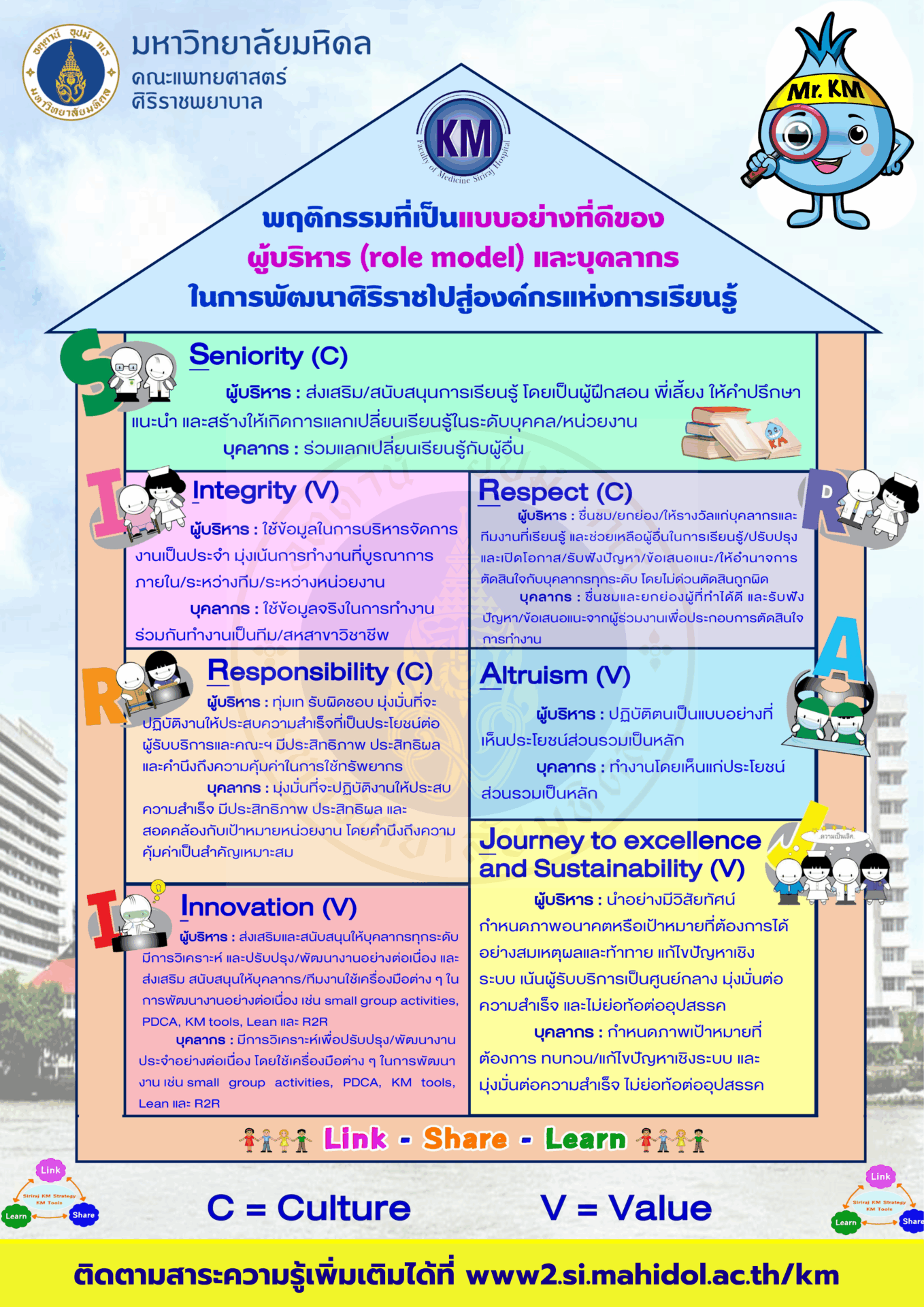 การพัฒนาองค์กรให้ก้าวสู่ “องค์กรแห่งการเรียนรู้” เริ่มต้นจากการมี แบบอย่างที่ดีในทุกระดับ ทั้งผู้บริหารและบุคลากรของศิริราชต่างร่วมกันแสดงพฤติกรรมที่สะท้อนวัฒนธรรมแห่งการเรียนรู้ การแบ่งปัน และการพัฒนาอย่างต่อเนื่อง