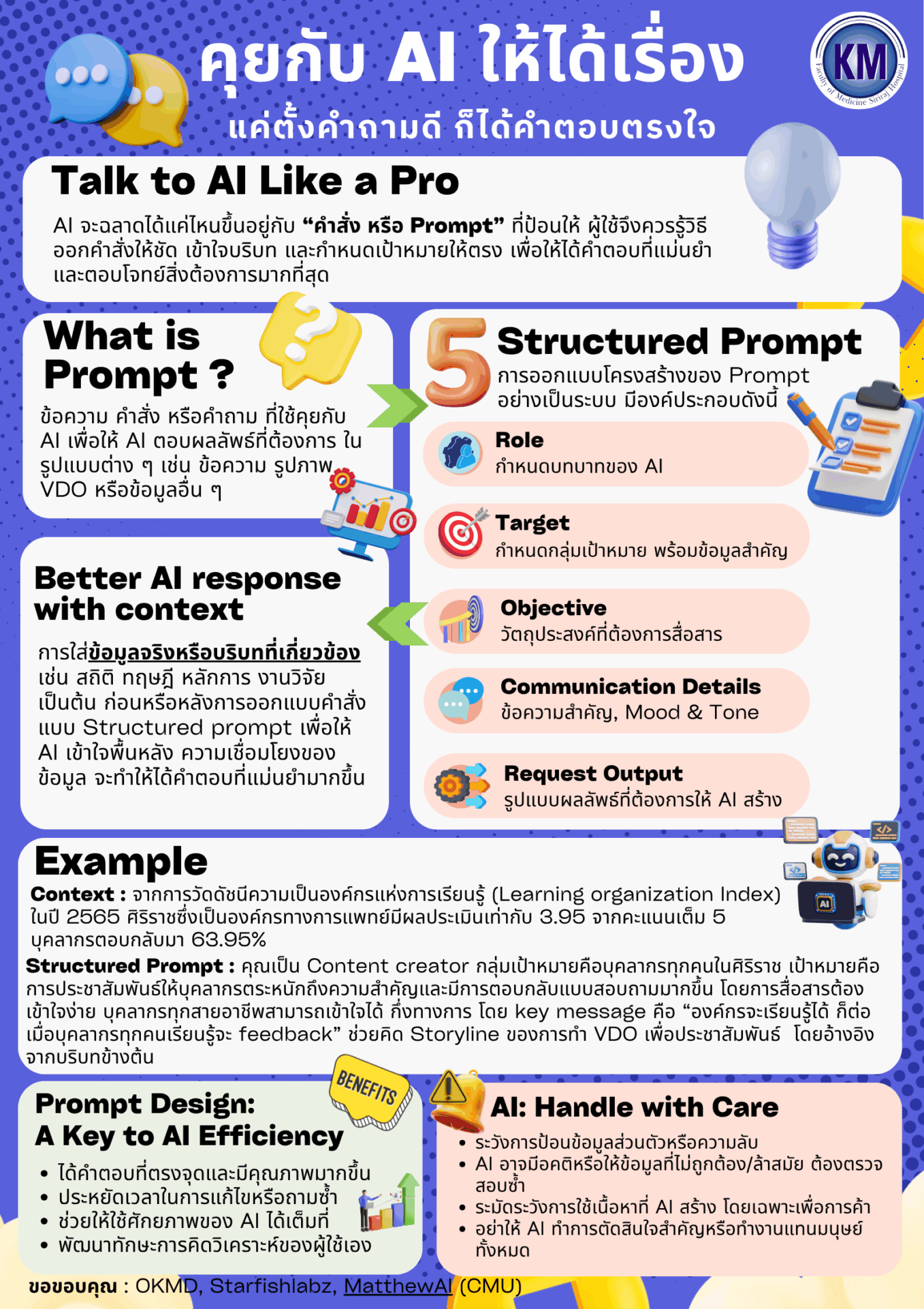 การออกแบบ Prompt อย่างเป็นระบบจะทำให้ AI ตอบคำถามได้แม่นยำ ตรงจุด มากขึ้น โดยมีองค์ประกอบ ดังนี้