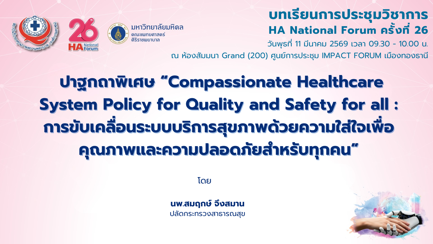 ปาฐกถาพิเศษ “Compassionate Healthcare System Policy for Quality and Safety for all : การขับเคลื่อนระบบบริการสุขภาพด้วยความใส่ใจเพื่อคุณภาพและความปลอดภัยสำหรับทุกคน”