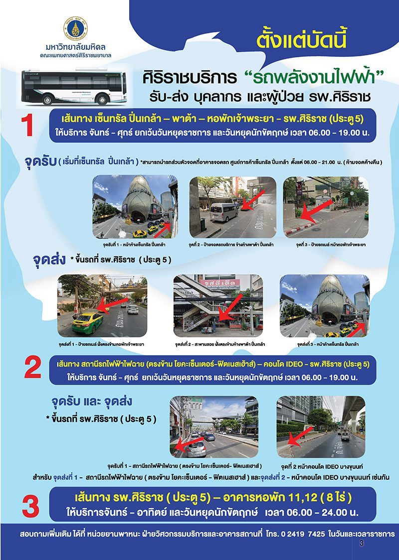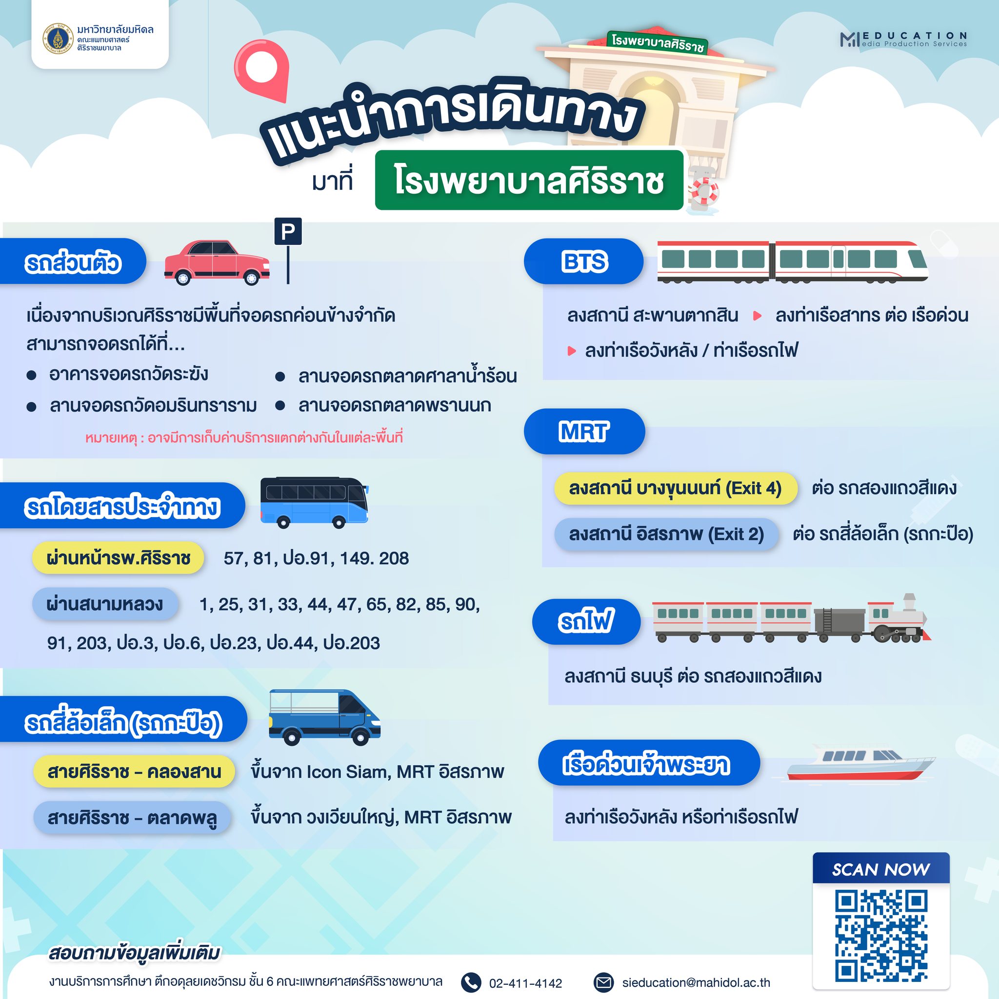 ทางโรงพยาบาลศิริราชได้จัดสถานที่จอดรถรถยนต์ส่วนบุคคลไว้บริการ ดังนี้ อาคารจอดรถ 1 (ใกล้ตึกอุบัติเหตุ), อาคารจอดรถหอกีฬา, อาคารจอดรถพื้นที่ 8 ไร่ (ร้านโกลเด้นเพลส และร้านภูฟ้าตรงข้ามศาลาน้ำเย็น)