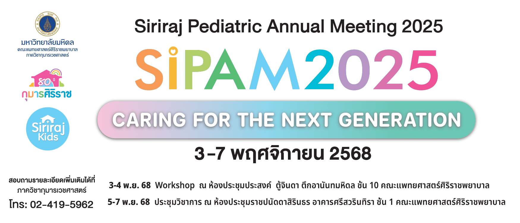 ภาควิชากุมารเวชศาสตร์ คณะแพทยศาสตร์ศิริราชพยาบาล ได้จัดการประชุมวิชาการประจำปี เรื่อง “Siriraj Pediatric Annual Meeting: Caring for the Next Generation โดยมีวัตถุประสงค์เพื่อให้อาจารย์แพทย์ แพทย์ประจำบ้าน แพทย์ประจำบ้านต่อยอด และกุมารแพทย์ทั่วไป รวมทั้งบุคลากรทางการพยาบาล ได้เรียนรู้ประสบการณ์ แก้ไขปัญหาในการดูแลผู้ป่วย การส่งเสริมให้เยาวชนเติบโตอย่างมีคุณภาพ ทั้งด้านร่างกาย จิตใจ การศึกษา และศักยภาพในการใช้ชีวิต ซึ่งการอบรมในครั้งนี้ประกอบด้วยทฤษฎีที่มีอยู่เดิม และเพิ่มเติมวิธีการใหม่ ๆ ทั้งในการวินิจฉัย และการรักษา ซึ่งเน้นการนำไปปฏิบัติได้จริงในโรงพยาบาลทั่วไป