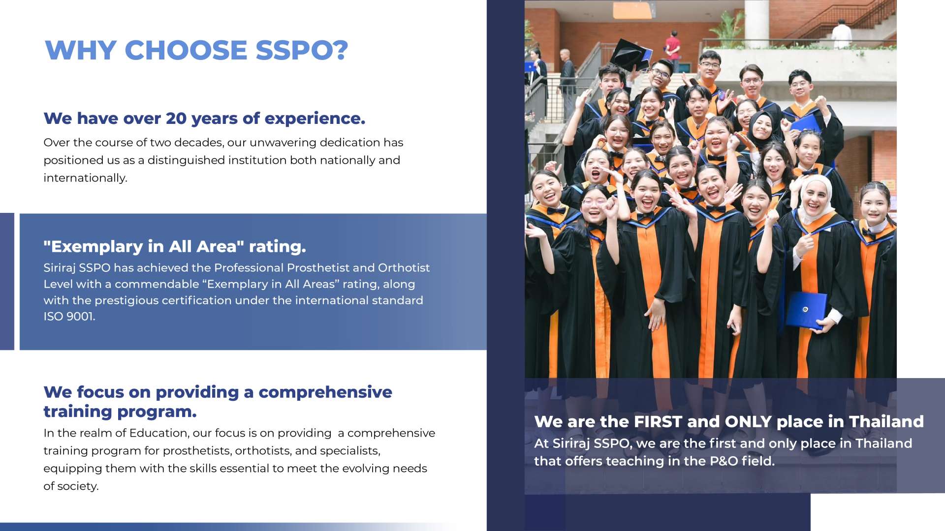 The Sirindhorn School of Prosthetics and Orthotics has a long standing tradition of excellence in the development of prosthetist orthotists in the region for over 15 years. The success of our programs are a reflection of our stellar faculty and a commitment to producing the next generation of leaders.