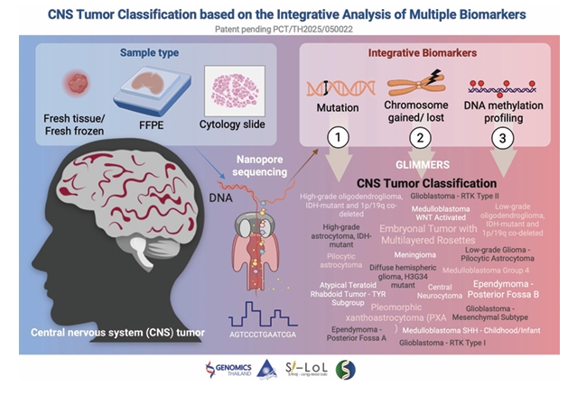 ล่าสุด Siriraj Long-read Lab (Si-LoL) ภายใต้ ศูนย์จีโนมิกส์ศิริราช (Siriraj Genomics) คณะแพทยศาสตร์ศิริราชพยาบาล มหาวิทยาลัยมหิดล ได้สร้างนวัตกรรมที่ช่วยพยาธิแพทย์ในการวินิจฉัยผู้ป่วยมะเร็งสมองได้อย่างแม่นยำและรวดเร็วยิ่งขึ้น นอกจากนี้ยังมีค่าใช้จ่ายที่ต่ำกว่าเมื่อเทียบกับการส่งชิ้นเนื้อไปตรวจที่ต่างประเทศ โดยทางคณะผู้วิจัยได้รับการสนับสนุนจากศูนย์ขับเคลื่อนนวัตกรรมเพื่อความเป็นเลิศ (Siriraj Excellent Innovation Center (SIEIC) ทำการยื่นคำขอสิทธิบัตรระหว่างประเทศ (PCT) ภายใต้ชื่อ “Method for Brain Tumor Classification based on The Integrative Analysis of Multiple Biomarkers”