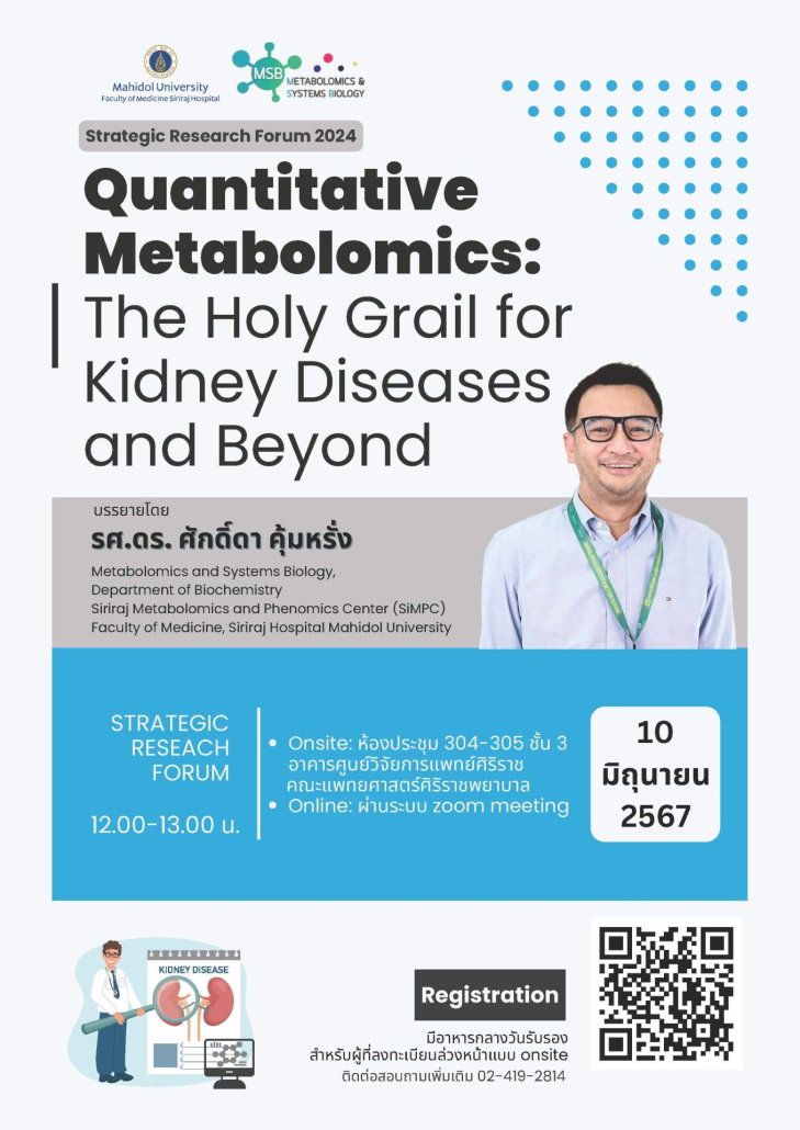 ฝ่ายวิจัย ขอประชาสัมพันธ์กิจกรรม Strategic Research Forum 2024 ประจำเดือนมิถุนายน 2567 ในหัวข้อการบยาย “Quantitative Metabolomics: The Holy Grail for Kidney Diseases and Beyond วิทยากร โดย รศ. ดร.ศักดิ์ดา คุ้มหรั่ง กลุ่มวิจัย Metabolomics and Systems Biology, Siriraj Metabolomics and Phenomics Center (SiMPC) ในวันจันทร์ที่ 10 มิถุนายน 2567 เวลา 12.00 -13.00 น. ณ ห้องประชุม 304 -305 ชั้น 3 อาคารศูนย์วิจัยการแพทย์ศิริราช คณะเเพทยศาสตร์ศิริราชพยาบาล เริ่มลงทะเบียน เข้างาน11.30 น. เป็นต้นไป