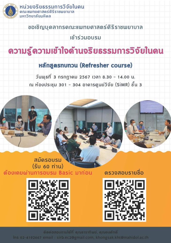 ขอเชิญบุคลากรศิริราชเข้าร่วมอบรมเรื่อง “ความรู้ความเข้าใจด้านจริยธรรมการวิจัยในคน หลักสูตรทบทวน (Refresher Course)” ปี พ.ศ. 2567 ครั้งที่ 1