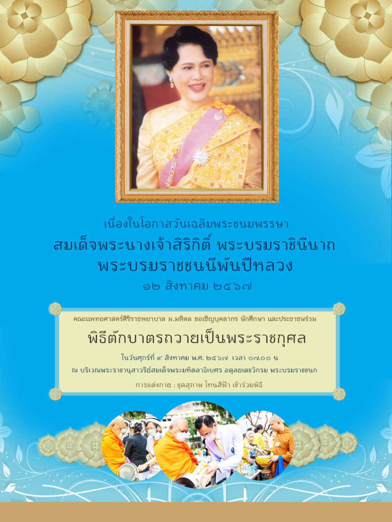 เนื่องในโอกาสวันเฉลิมพระชนมพรรษา 12 สิงหาคม 2567 สมเด็จพระนางเจ้าสิริกิติ์ พระบรมราชินีนาถ พระบรมราชชนนีพันปีหลวง เพื่อแสดงความจงรักภักดีและสำนึกในพระมหากรุณาธิคุณ คณะแพทยศาสตร์ศิริราชพยาบาล จึงกำหนดจัดพิธี ทำบุญตักบาตรเพื่อถวายพระราชกุศล ในวันศุกร์ที่ 9 สิงหาคม 2567 เวลา 07.00 น. ณ บริเวณลานพระราชานุสาวรีย์สมเด็จพระมหิตลาธิเบศร อดุลยเดชวิกรม พระบรมราชชนก