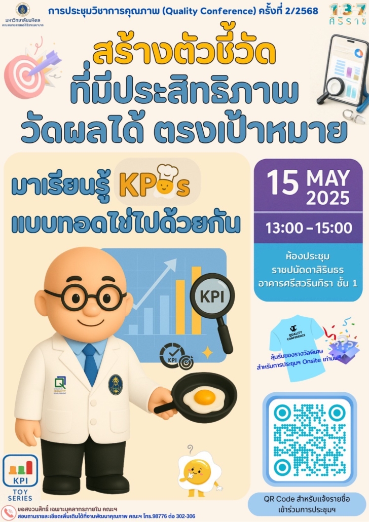 งานพัฒนาคุณภาพ ขอเชิญเข้าร่วมการประชุมวิชาการคุณภาพ (Quality Conference) ครั้งที่ 2/2568 ในหัวข้อ “สร้าง KPIs ที่มีประสิทธิภาพ: วัดผลให้ตรงเป้าหมาย” ในวันพฤหัสบดีที่ 15 พฤษภาคม 2568 เวลา 13.00 – 15.00 น. ณ ห้องประชุมราชปนัดดาสิรินธร อาคารศรีสวรินทิรา ชั้น G โรงพยาบาลศิริราช สอบถามรายละเอียดเพิ่มเติมได้ที่ งานพัฒนาคุณภาพ โทร. 98776, 9876