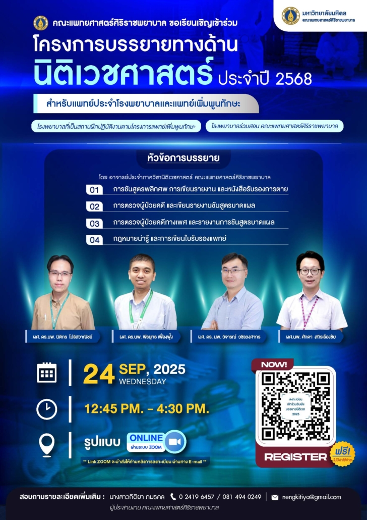 ฝ่ายการศึกษาและภาควิชานิติเวชศาสตร์ ขอเชิญเข้าร่วมฟังบรรยายทางด้านนิติเวชศาสตร์ ประจำปี 2568 สำหรับแพทย์ประจำโรงพยาบาลเเละเเพทย์เพิ่มพูนทักษะ ในวันที่ 24 กันยายน 2568 เวลา 12.45 – 16.30 น. รูปเเบบออนไลน์ผ่านระบบ ZOOM