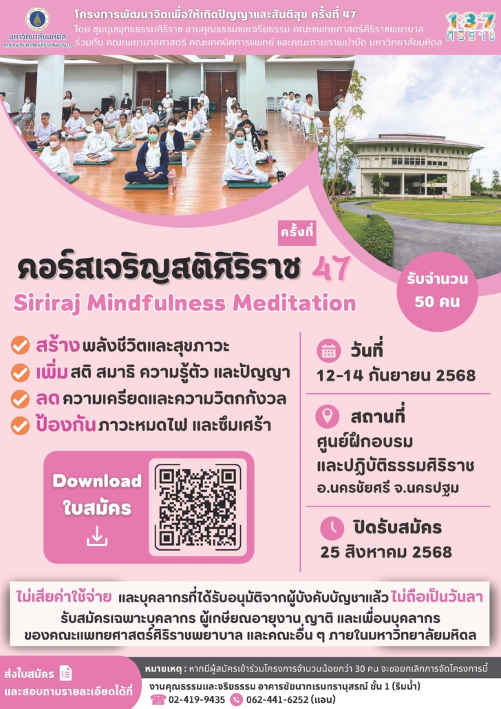 งานคุณธรรมและจริยธรรม ขอเชิญบุคลากร ผู้เกษียณอายุงาน ญาติและเพื่อนบุคลากรของคณะแพทยศาสตร์ศิริราชพยาบาล และคณะอื่น ๆ ภายในมหาวิทยาลัยมหิดล เข้ารับการอบรม “โครงการพัฒนาจิตเพื่อให้เกิดปัญญาและสันติสุข หรือคอร์สเจริญสติศิริราช (Siriraj Mindfulness Meditation Course) ครั้งที่ 47” จัดระหว่างวันที่ 12-14 กันยายน 2568 (3 วัน 2 คืน) ณ ศูนย์ฝึกอบรมและปฏิบัติธรรมศิริราช จังหวัดนครปฐม เปิดรับสมัครคั้งเเต่วันนี้ – 25 สิงหาคม 2568