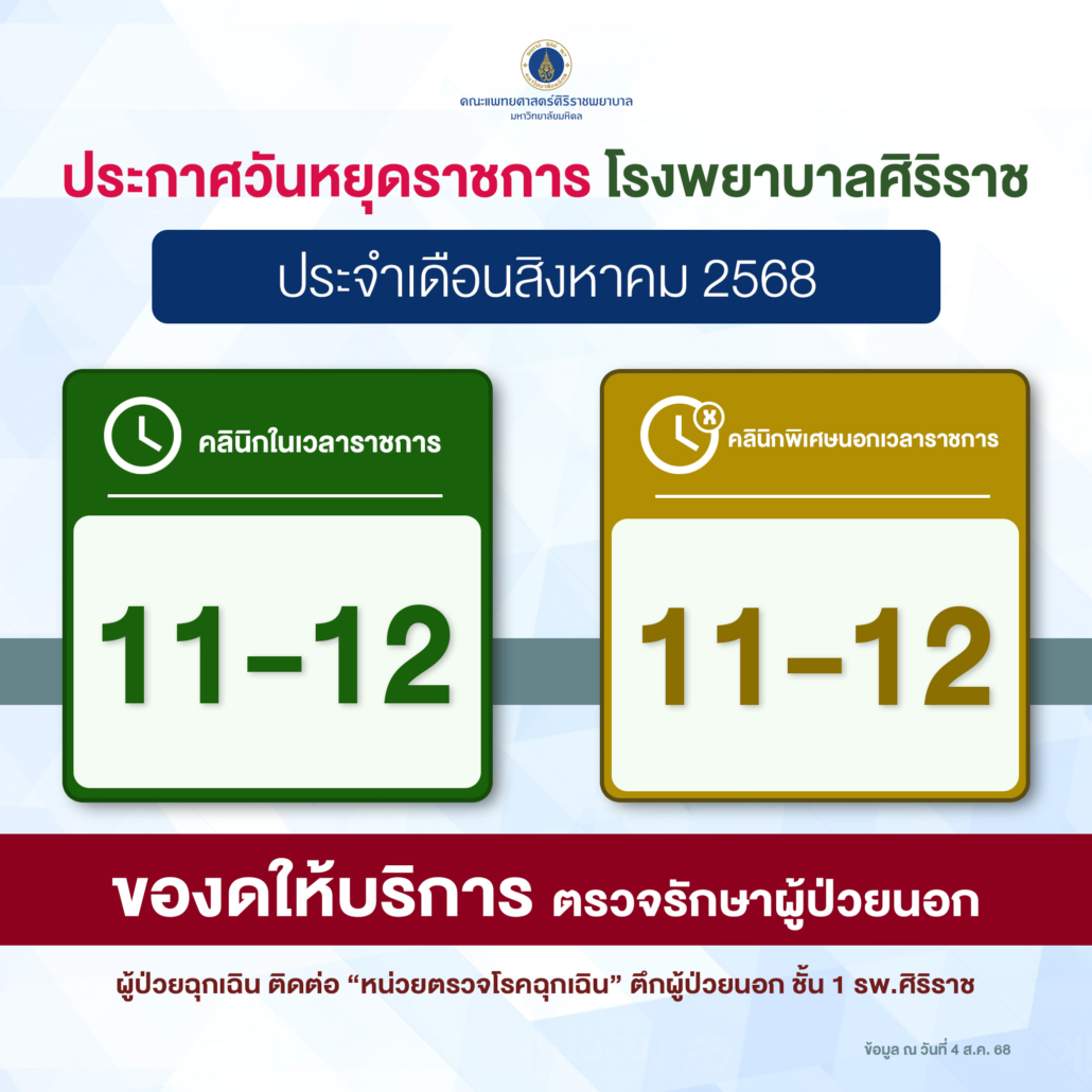 ประกาศวันหยุดราชการ โรงพยาบาลศิริราช ระหว่างวันที่ 11 – 12 สิงหาคม 2568