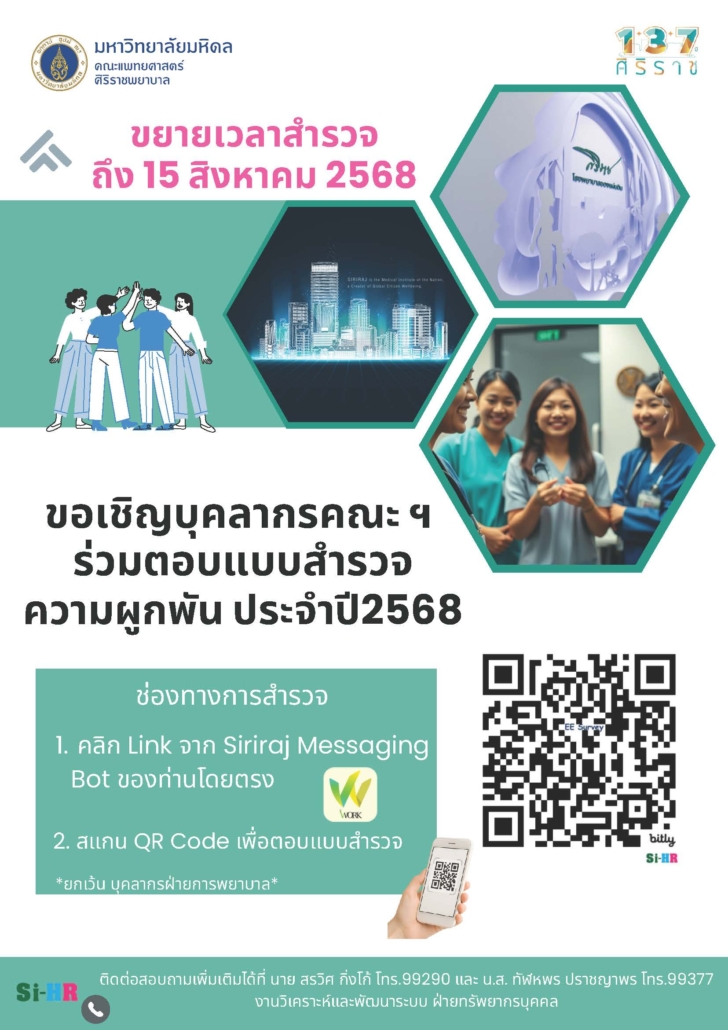 ขอเชิญบุคลากร ร่วมตอบแบบสำรวจความผูกพัน ประจำปี 2568 ตั้งเเต่วันนี้-15 ส.ค. 68