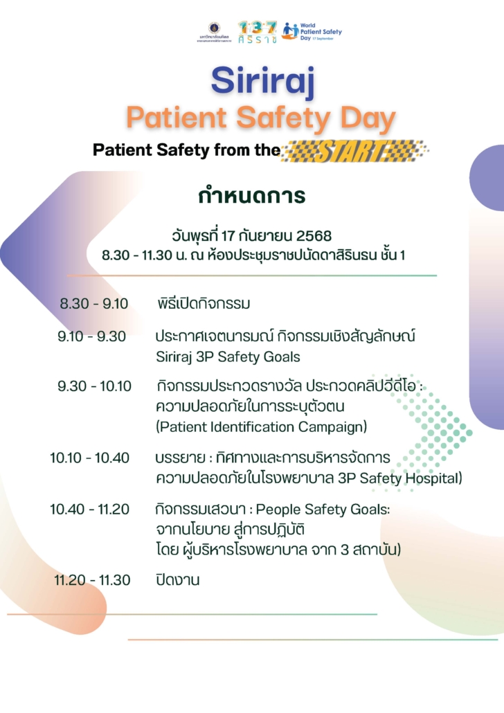สำนักงานผู้อำนวยการโรงพยาบาลศิริราช ขอเชิญร่วมกิจกรรรม Siriraj Patient Safety Day ในหัวข้อ “Patient Safety from the Start เพราะความปลอดภัยของผู้ป่วย เริ่มที่เรา” พร้อมประกาศและแสดงเจตนารมณ์ สร้างการมีส่วนร่วมและความตระหนักในความปลอดภัย ซึ่งองค์กรด้านสุขภาพทั่วโลกจะจัดกิจกรรมส่งเสริมความปลอดภัยของผู้ป่วยพร้อมกัน ขณะเดียวกัน สถาบันรับรองคุณภาพสถานพยาบาล (องค์การมหาชน) หรือ สรพ. ได้กำหนดให้วันที่ 17 กันยายนของทุกปี เป็นวันแห่งความปลอดภัยของผู้ป่วยและบุคลากรสาธารณสุขด้วยเช่นกัน เพื่อให้ความสำคัญทั้งผู้ป่วยที่มารับบริการ และบุคลการสาธารณสุขซึ่งเป็นผู้ที่มีโอกาสเกิดความคลาดเคลื่อนในด้านต่างๆ ได้