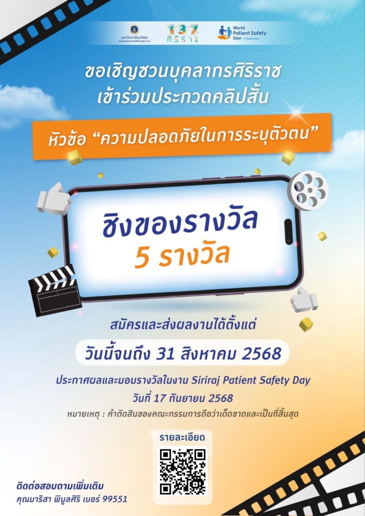 กิจกรรรม Siriraj Patient SafetyDay เเละเชิญชวนร่วมส่งผลงานประกวดคลิปสั้น หัวข้อ “ความปลอดภัยในการระบุตัวตน”